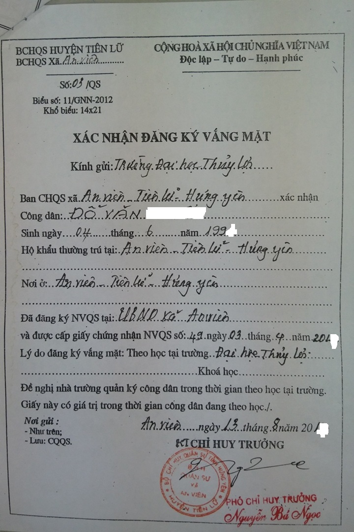 – Đối với nam trong độ tuổi nghĩa vụ quân sự: Giấy chứng nhận đăng ký nghĩa vụ quân sự do BCH quân sự cấp Quận (Huyện) cấp và Giấy xác nhận đăng ký vắng mặt do BCH quân sự cấp Phường (Xã) nơi cư trú cấp;