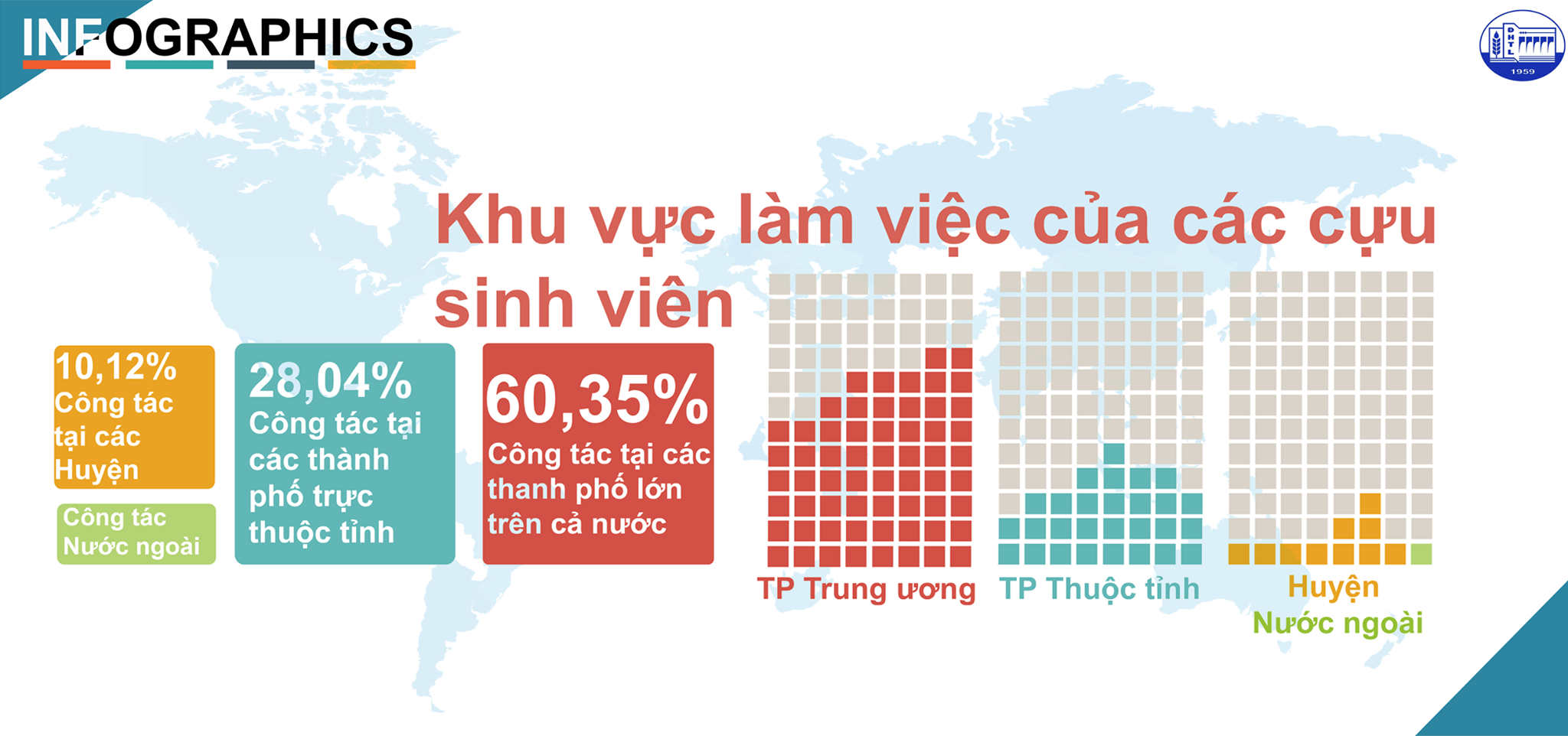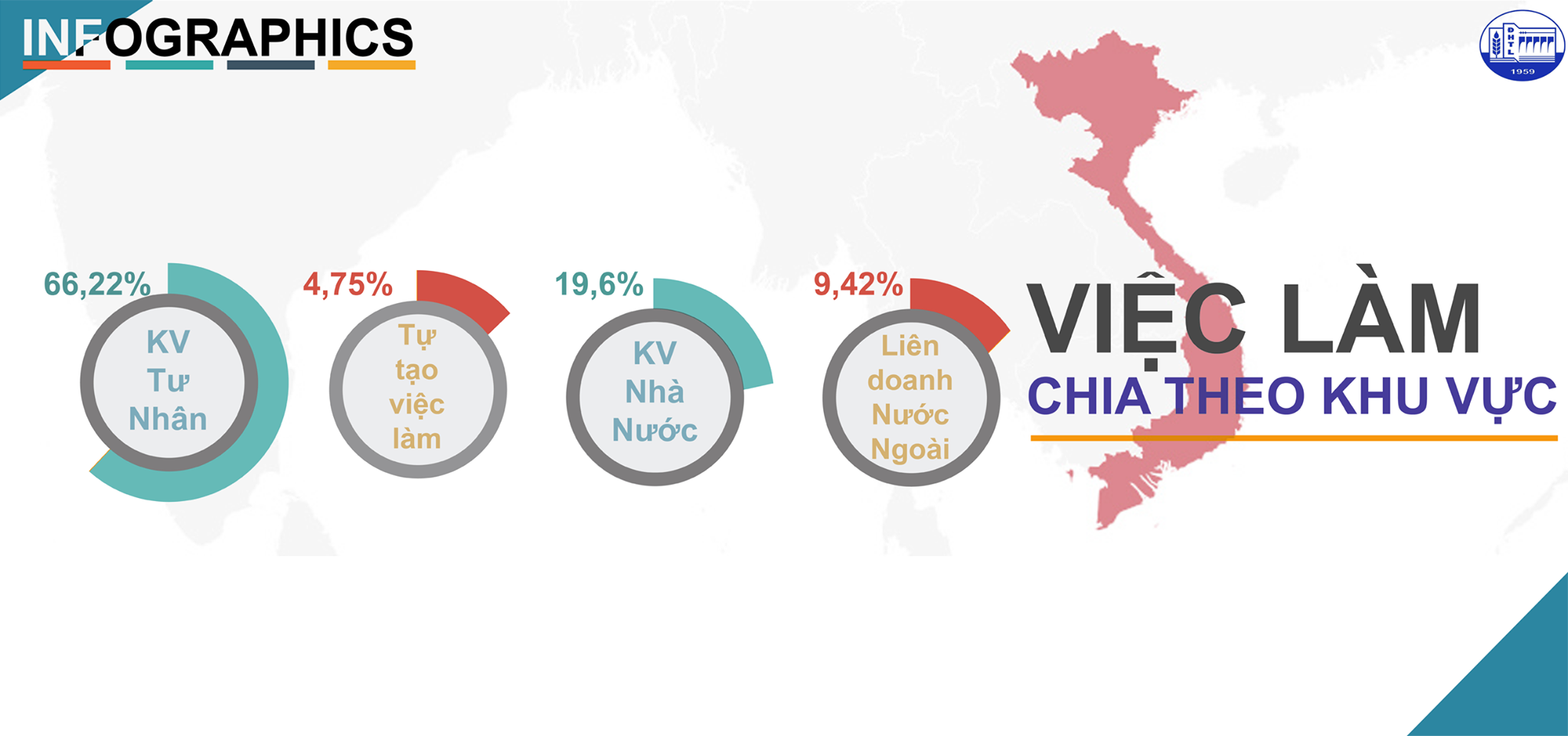 Cũng tại cuộc khảo sát này, với tiêu chí về khu vực làm việc chia theo khối đơn vị sự nghiệp thì tỷ lệ sinh viên tốt nghiệp làm việc tại các doanh nghiệp tư nhân chiểm tỷ lệ rất cao lên tới 66%. Trong khi chỉ có gần 20% công tác tại các cơ quan, doanh nghiệp Nhà nước. Đã có gần 5% sinh viên khởi nghiệp tức là tự thành lập công ty, doanh nghiệp, kinh doanh cá thể.
