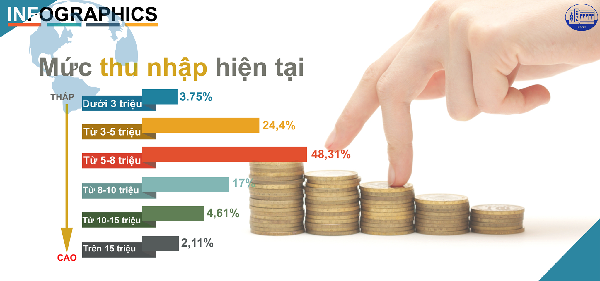 Sau một năm tốt nghiệp, các cựu sinh viên cho biết, họ đã có được công việc khá ổn định, nhiều người trong số họ đã có được vị trí nhất định trong cơ quan, doanh nghiệp. Khi được hỏi về mức thu nhập hàng tháng của mình, gần 50% cho biết hiện có mức thu nhập từ 5 đến 8 triệu đồng. Đây có thể coi là một mức trung bình đối với một kỹ sư, cử nhân mới ra trường có thể đạt được để có thể chi tiêu tại các thành phố lớn. Cá biệt có 2,11% mức thu nhập hàng tháng trên 15 triệu đồng.