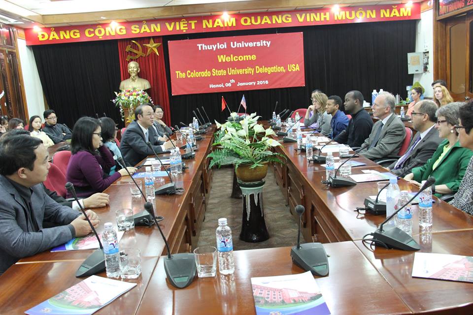 Tại buổi gặp mặt, Lãnh đạo hai trường đã có cuộc hội đàm trao đổi chuyên môn. Thay mặt Nhà trường, GS.TS.Trịnh Minh Thụ – Phó Hiệu trưởng trường Đại học Thủy Lợi gửi lời chào, lời chúc mừng năm mới đồng thời bày tỏ vui mừng khi được đón tiếp đoàn công tác của trường Đại học Bang Colorado.Trường đại học Thủy lợi luôn hoan nghênh và chào đón các thầy cô, sinh viên của trường Colorado đến thăm và học tập, nghiên cứu, giảng dạy tại trường. Trong thời gian tới hi vọng sẽ có nhiều chương trình hợp tác đào tạo hơn nữa giữa hai trường trên các lĩnh vực nghiên cứu khoa học, giáo dục và đào tạo.
