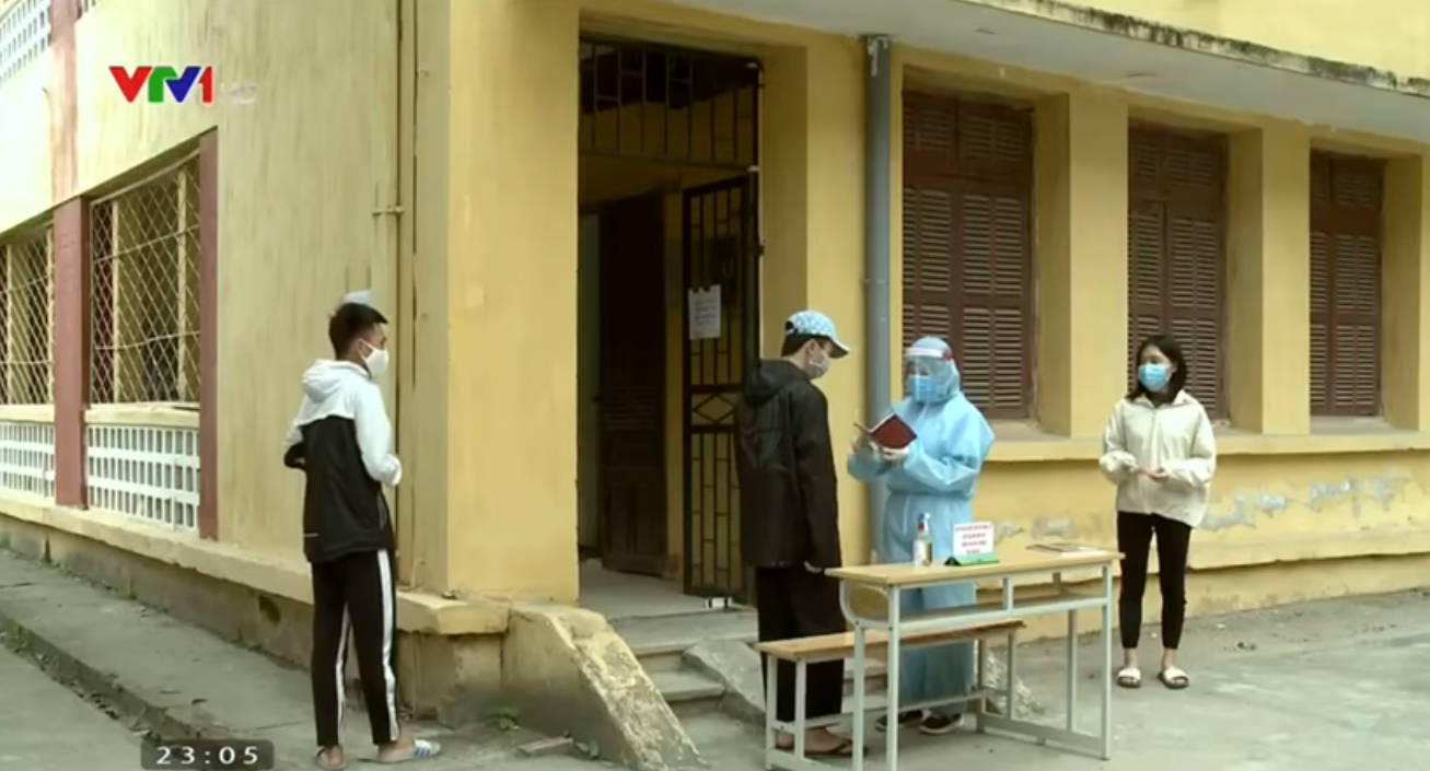 Các cán bộ y tế thăm khám sức khỏe cho sinh viên đi về từ vùng dịch Hải Dương (ảnh cắt từ video)