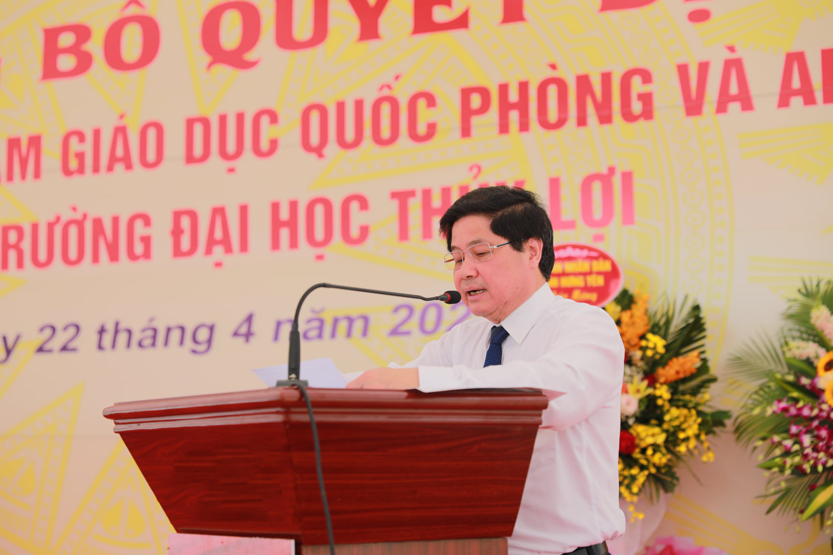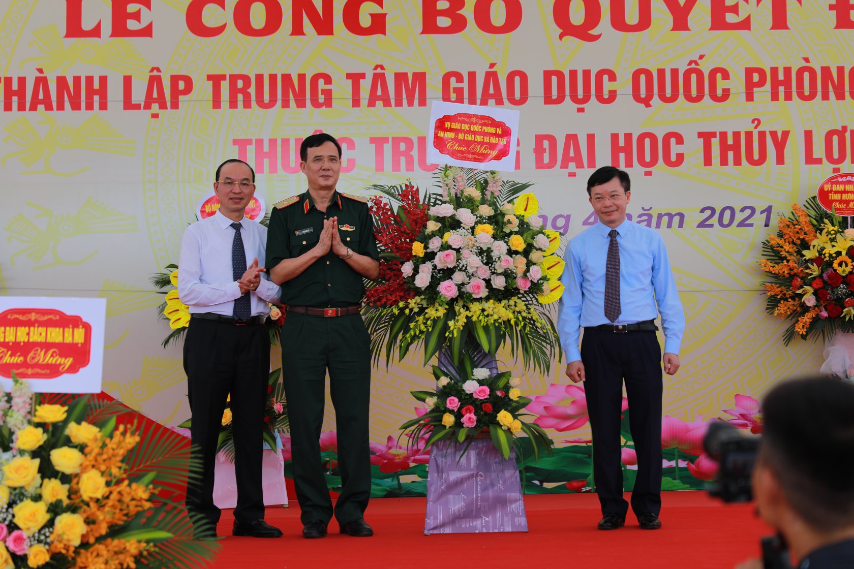 Thiếu tướng, TS. Phạm Đức Tú, Vụ trưởng Vụ GDQP&AN, Bộ Giáo dục và Đào tạo tặng hoa chúc mừng Trường Đại học Thủy lợi