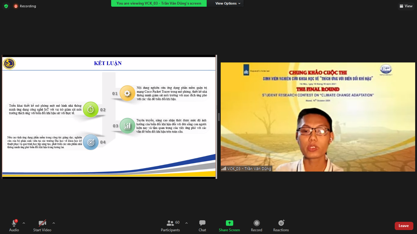 Tham dự Chung khảo cuộc thi, Trường Đại học Thủy lợi có 07 đề tài đến từ sinh viên các khoa: Kỹ thuật tài nguyên nước, Hóa – Môi trường, Công trình, Kinh tế và Quản lý. Các đề tài dự thi tập trung chủ yếu vào các lĩnh vực nghiên cứu thế mạnh của trường như: thủy văn, tài nguyên nước, thiết kế công trình, phòng tránh và giảm nhẹ thiên tai, xử lý môi trường. Trong đó, các nghiên cứu đã làm rõ các tác động của biến đổi khí hậu đến các hoạt động kinh tế, xã hội và con người, từ đó đề xuất các giải pháp thích ứng và giảm nhẹ thiệt hại.