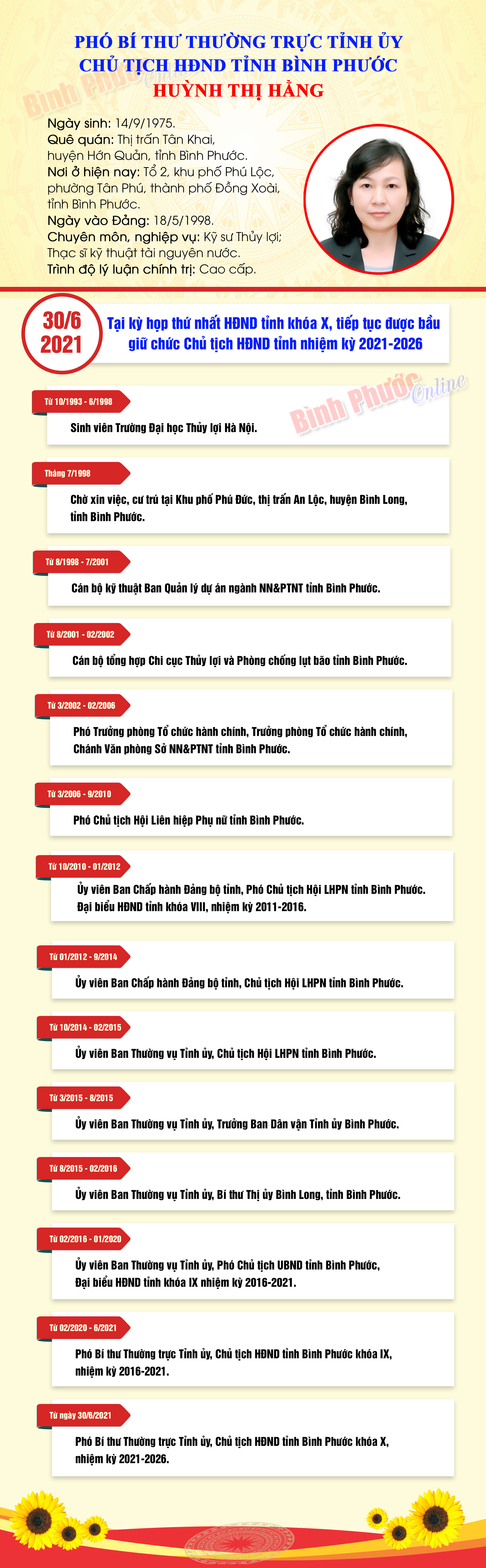 Theo đó, bà Huỳnh Thị Hằng, Phó bí thư Thường trực Tỉnh ủy, Chủ tịch HĐND tỉnh khóa IX tiếp tục được bầu giữ chức Chủ tịch HĐND tỉnh khóa X, nhiệm kỳ 2021-2026. Bà Hằng là cựu sinh viên K35 Trường Đại học Thủy lợi, là thành viên của đội tuyển SV, từng vô địch SV’96 – chương trình truyền hình tạo dấu ấn của kênh VTV3 khi mới ra đời vào năm 1996. Bà cũng là thành viên có nhiều đóng góp tích cực cho sự phát triển của Chi hội cựu sinh viên Trường tại tỉnh Bình Phước.