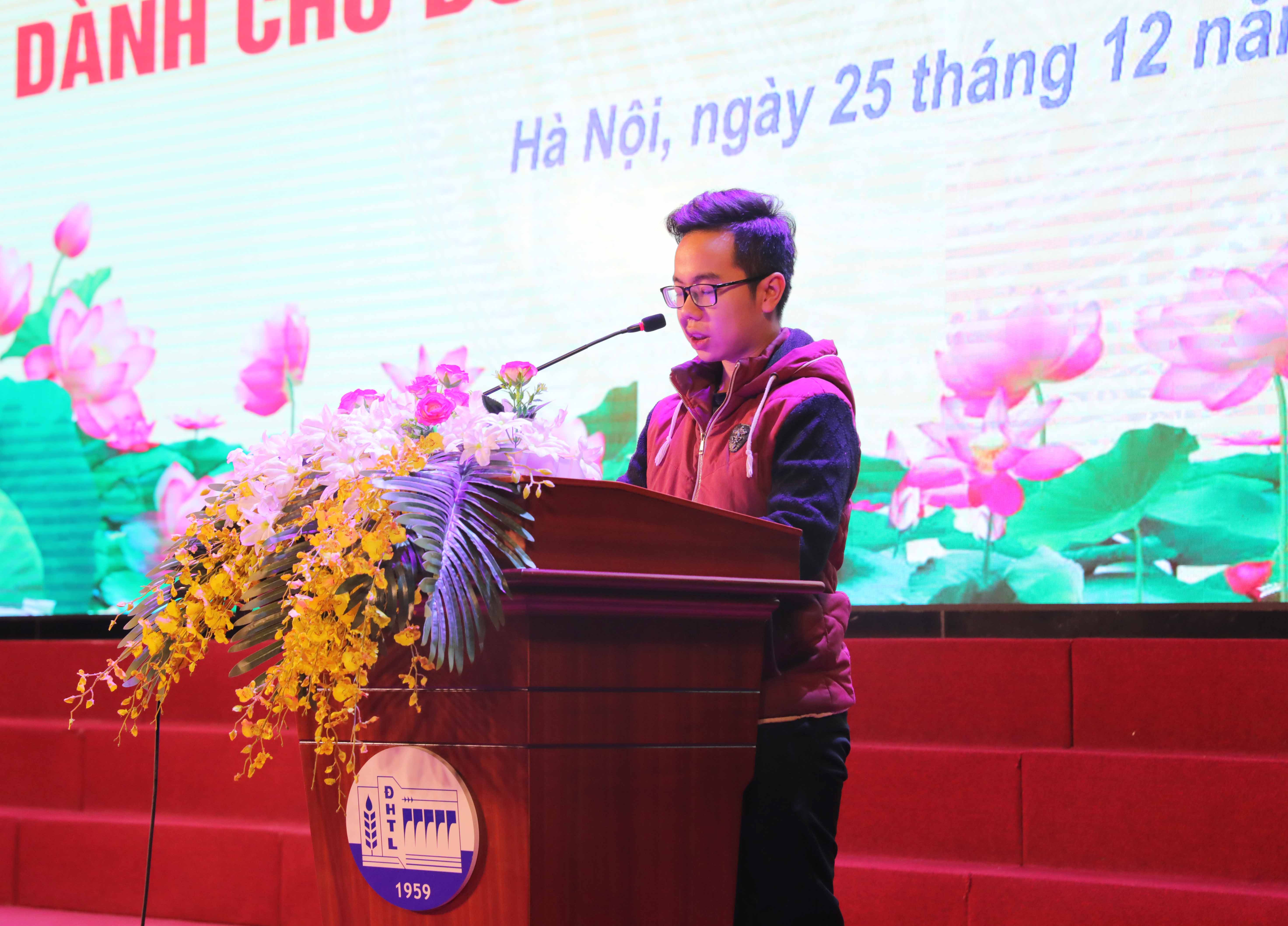 Quần chúng Đỗ Tiến Đạt – Sinh viên lớp 60TH4, Khoa CNTT, Trường Đại học Thủy lợi thay mặt các quần chúng ưu tú phát biểu, thể hiện niềm vinh dự, tự hào khi được chi bộ lựa chọn giới thiệu tham gia Khóa học bồi dưỡng lý luận chính trị dành cho đối tượng kết nạp Đảng và xin hứa sẽ học tập nghiêm túc để sau khi hoàn thành khóa học sẽ tiếp tục phấn đấu để sớm được đứng trong hàng ngũ của Đảng.