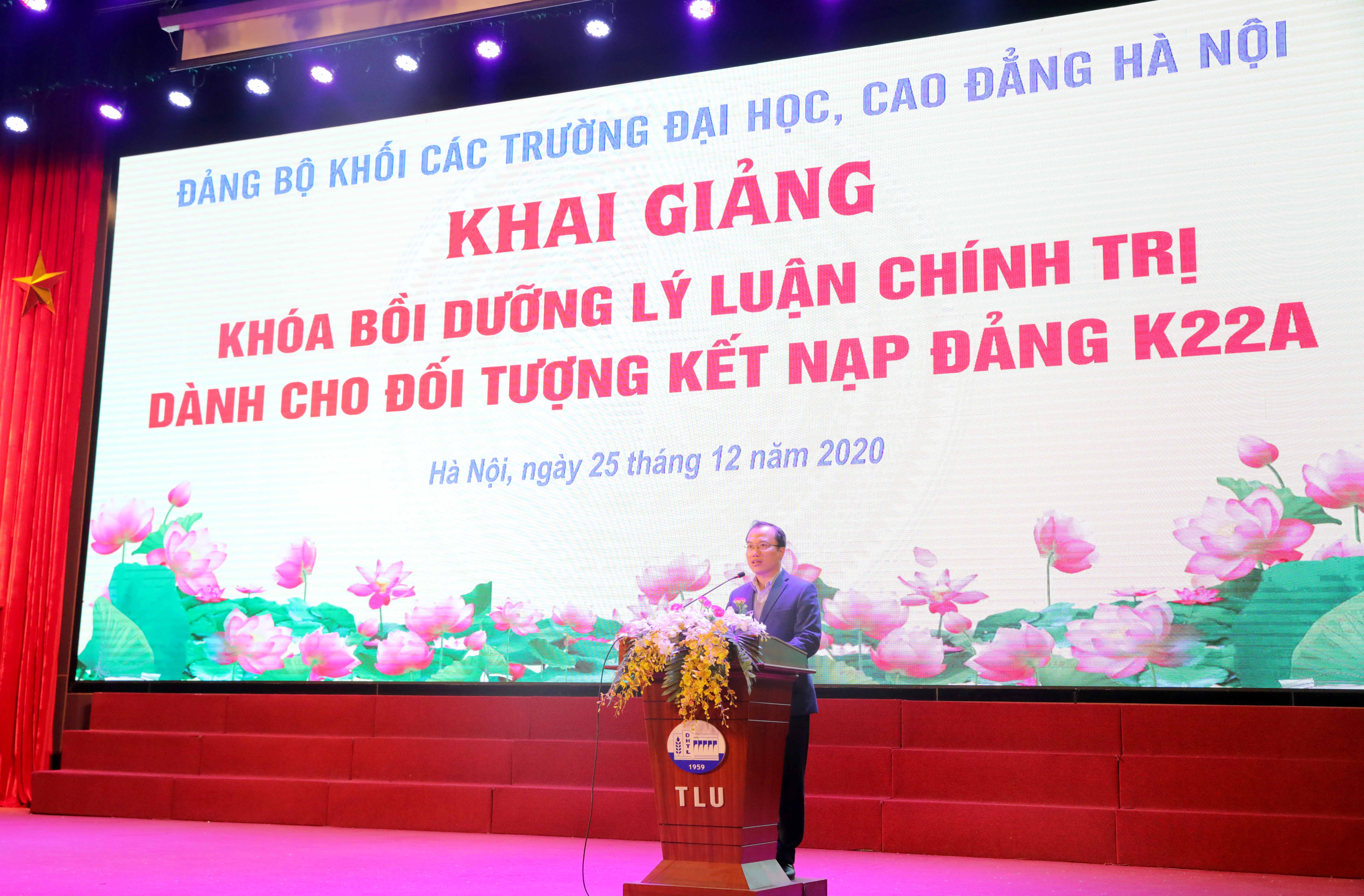 Sáng nay 25/12, tại Hội trường T45, Trường Đại học Thủy lợi tổ chức Khai giảng khóa bồi dưỡng lý luận chính trị dành cho đối tượng kết nạp Đảng – lớp K22A. Tham dự buổi lễ có PGS.TS. Nguyễn Ngọc Thắng – Ủy viên Ban thường vụ Đảng ủy – Chủ tịch Công đoàn Trường – Phó trưởng Khoa Công trình; đại diện Đảng ủy, Đoàn thanh niên và 267 quần chúng ưu tú là những cán bộ, giảng viên, sinh viên đến từ Đảng bộ Trường Đại học Thủy lợi, Trường Đại học Công nghệ và Quản lý hữu nghị.