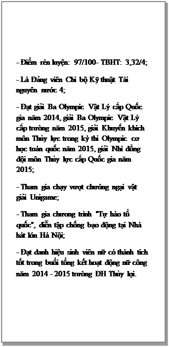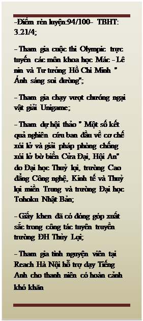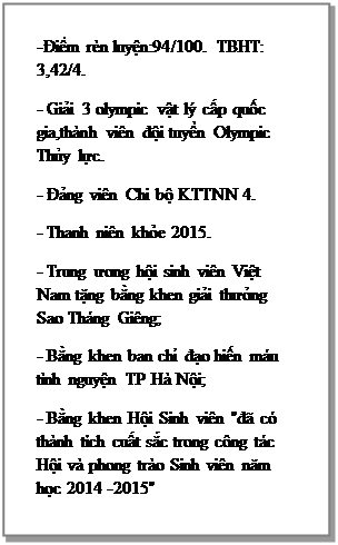 ![]() Sinh viên 5 tốt thủ đô – Nguyễn Trọng Khang | – Điểm rèn luyện: 98/100- TBHT: 3,42/4; – Giải Nhất Kỳ thi Olympic Toán Sinh viên Toàn Quốc; – Tham gia Giải chạy Unigames; – Bằng khen của Hội Toán học Việt Nam; – Khen thưởng của Đoàn trường về có thành tích xuất sắc hoạt động CLB Thanh niên tình nguyện vận động HMNĐ; – Tham gia các chương trình tình nguyện lớn như Xuân Hồng, Trái tim tình nguyện, Mùa hè xanh…;