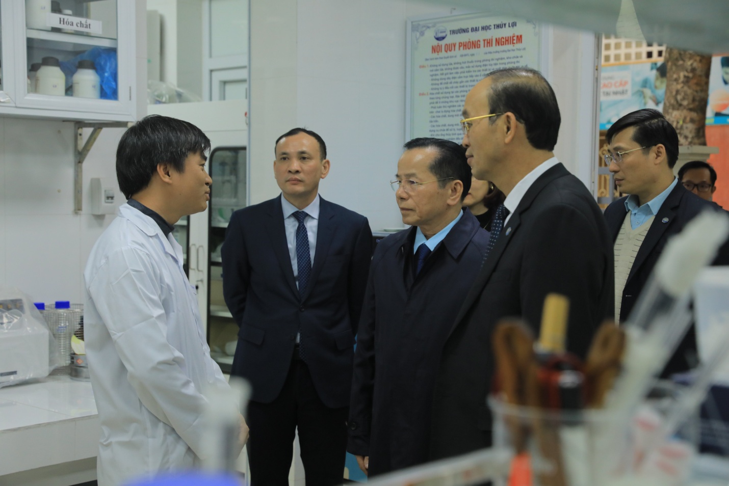 Tại phòng thí nghiệm Kỹ thuật hóa học, lãnh đạo Nhà trường báo cáo những thành tích nổi bật mà thầy và trò ngành Kỹ thuật Hóa học đạt được trong những năm qua. Thời gian gần đây, bằng việc cho ra mắt nhiều sản phẩm hữu ích với xã hội như nước rửa tay khô sát khuẩn phòng chống dịch bệnh Covid19, đặc biệt là tham gia Ngày hội khởi nghiệp quốc gia 2020 với sản phẩm “Nước rửa chén Sapowash” của sinh viên ngành Kỹ thuật Hóa học và đã giành giải Ba toàn quốc. Có thể nói đây là những thành tích đáng được ghi nhận.