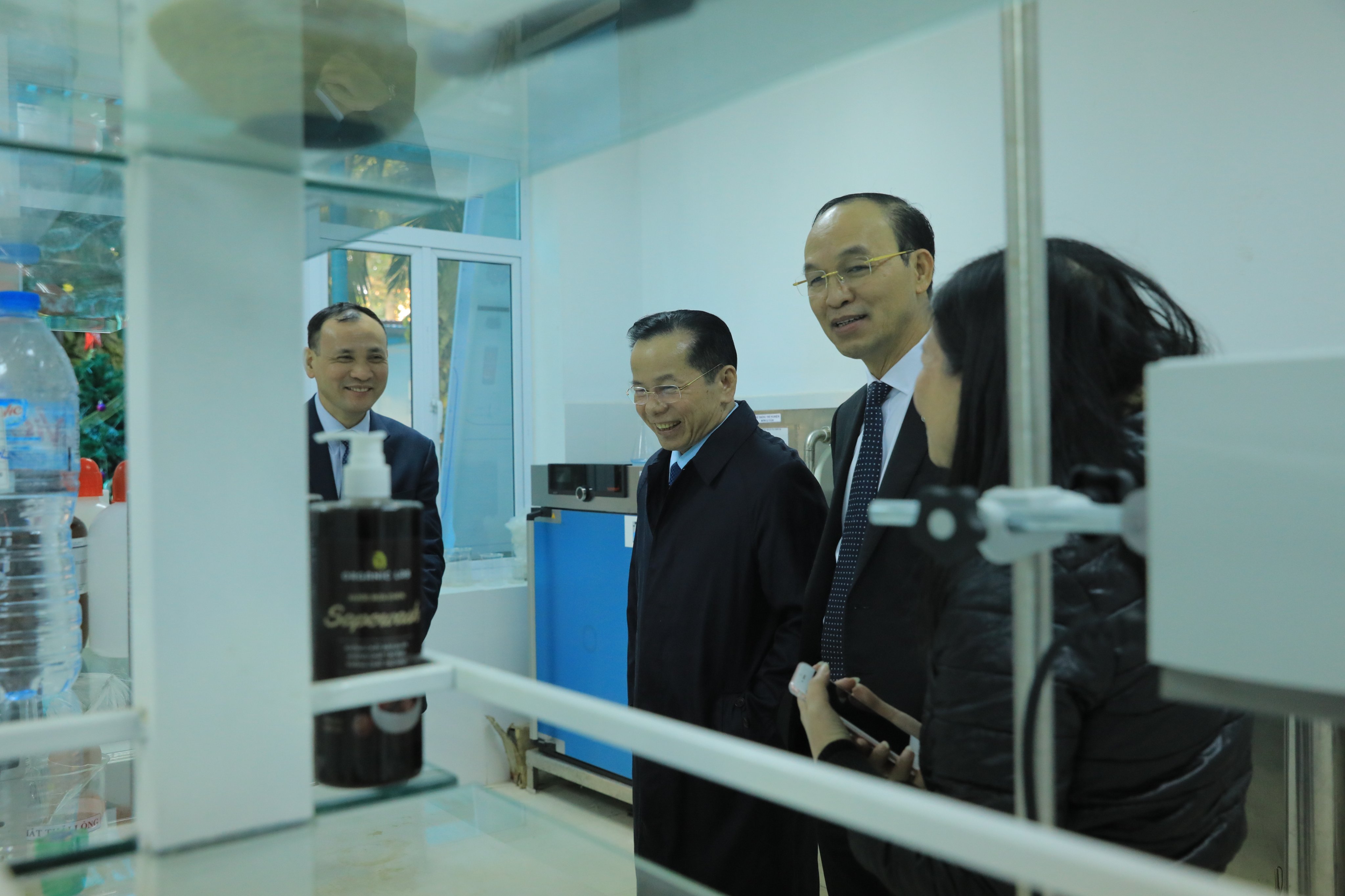 Tại phòng thí nghiệm Kỹ thuật hóa học, lãnh đạo Nhà trường báo cáo những thành tích nổi bật mà thầy và trò ngành Kỹ thuật Hóa học đạt được trong những năm qua. Thời gian gần đây, bằng việc cho ra mắt nhiều sản phẩm hữu ích với xã hội như nước rửa tay khô sát khuẩn phòng chống dịch bệnh Covid19, đặc biệt là tham gia Ngày hội khởi nghiệp quốc gia 2020 với sản phẩm “Nước rửa chén Sapowash” của sinh viên ngành Kỹ thuật Hóa học và đã giành giải Ba toàn quốc. Có thể nói đây là những thành tích đáng được ghi nhận.