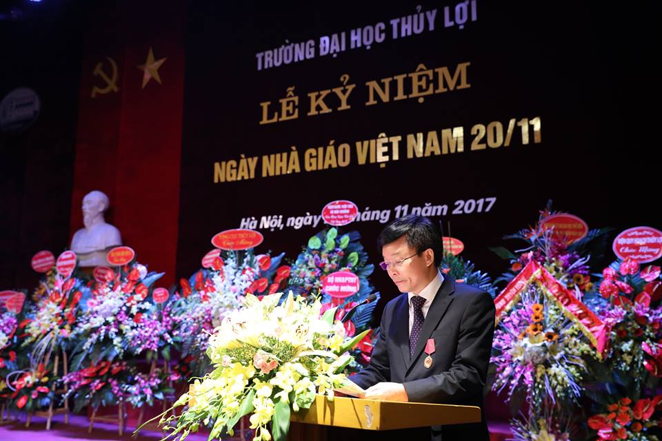 Phát biểu tại buổi lễ, GS. TS Nguyễn Quang Kim – Bí thư Đảng ủy – Hiệu trưởng đã gửi lời chúc mừng và tri ân đến các thế hệ thầy/cô giáo đã luôn sát cánh đối với mỗi bước tiến của Nhà trường trong sự nghiệp trồng người cao quý. Năm 2016 – 2017, với sự đồng lòng, quyết tâm của tập thể lãnh đạo, toàn thể cán bộ viên chức, giảng viên và sinh viên, sự chỉ đạo sâu sát và giúp đỡ của Bộ NN&PTNT, Bộ GD&ĐT Trường Đại học Thủy lợi đã gặt hái được nhiều thành quả đáng ghi nhận, trở thành một trong những trường đại học đầu ngành, đào tạo đa lĩnh vực. Cùng với đó, hoạt động nghiên cứu khoa học, chuyển giao công nghệ và hợp tác quốc tế được duy trì và phát triển. Nhiều nhà giáo được trao tặng những phần thưởng cao quý; nhiều sinh viên giành được giải thưởng cao trong các kỳ thi như Olympic Cơ học toàn quốc, thi Đồ án tốt nghiệp xuất sắc – giải thưởng Loa thành…