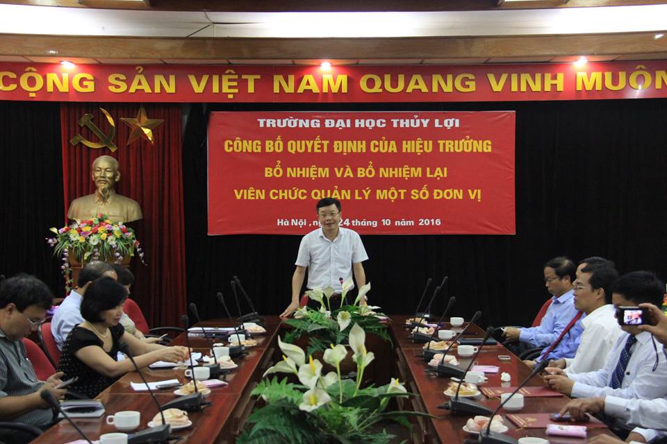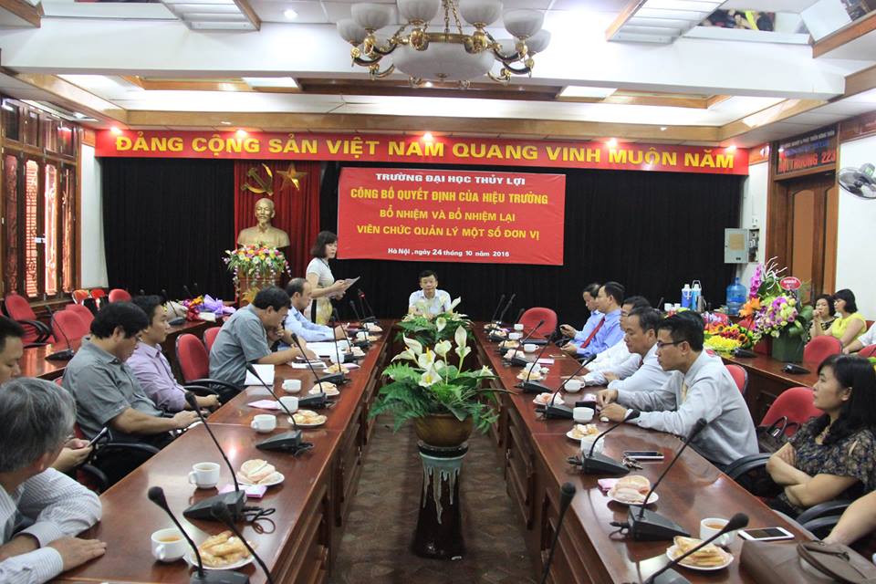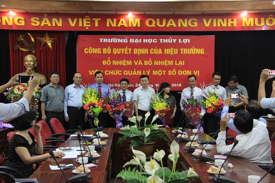Buổi công bố quyết định được diễn ra tại phòng 223/A1, theo đó, Hiệu trưởng Trường Đại học Thủy lợi đã ký quyết định bổ nhiệm và bổ nhiệm lại một số cán bộ trong trường. TS Đoàn Yên Thế – Phó Trưởng Khoa Cơ khí được bổ nhiệm vào vị trí Trưởng Khoa Cơ khí, Ths Mai Quang Khoát – Phó Viện trưởng Viện Đào tạo và KHƯD Miền Trung (Viện ĐT&KHƯD MT) được bổ nhiệm vào vị trí Viện trưởng Viện ĐT&KHƯDMT; Ths Đỗ Cảnh Hào tiếp tục được bổ nhiệm giữ chức vụ Phó Viện trưởng Viện ĐT&KHƯDMT; Ths Bùi Anh Dũng tiếp tục giữ chức vụ Phó Viện trưởng Viện KHƯD MT; Ths Nguyễn Thị Hồng Vĩnh tiếp tục giữ chức vụ Trưởng Phòng, phụ trách Văn phòng Đảng ủy.