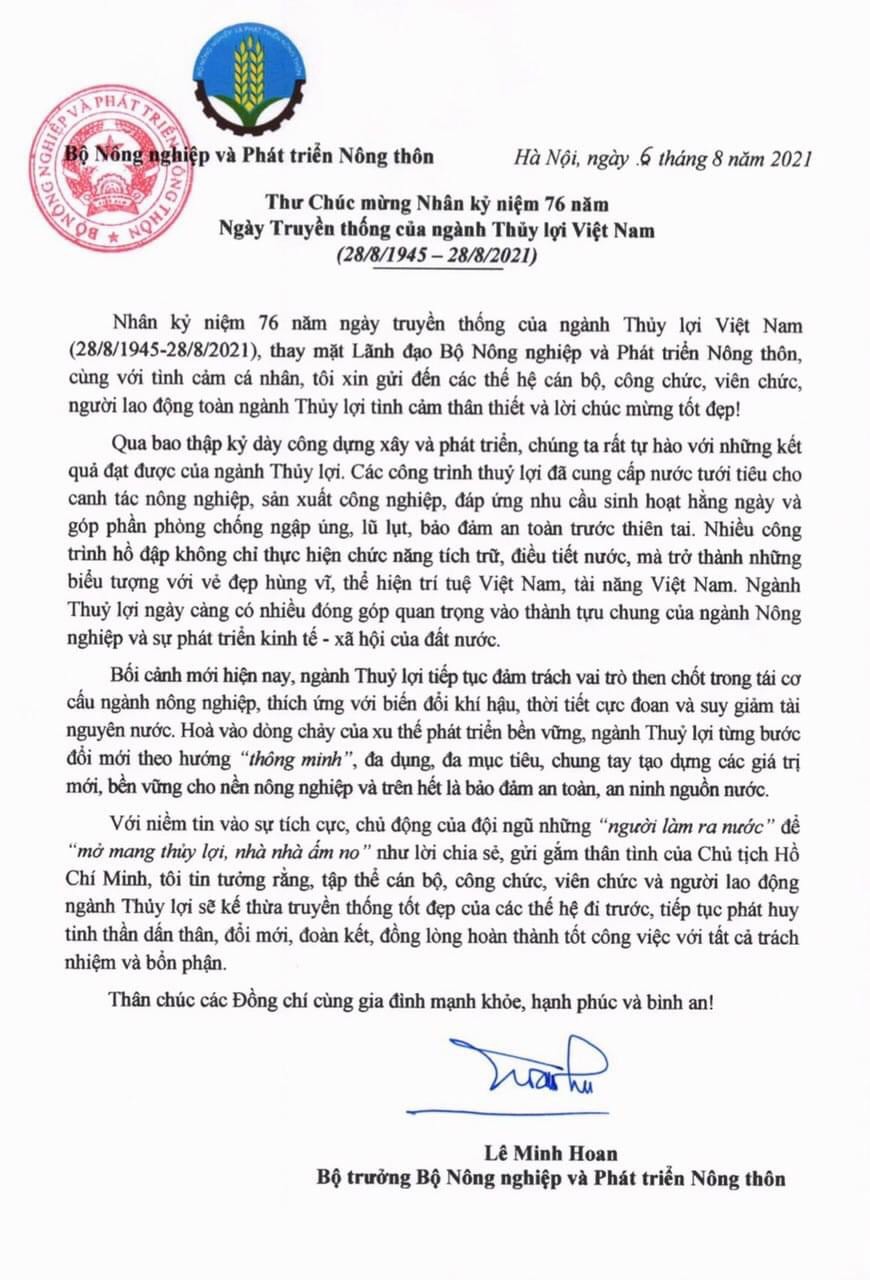 Bộ trưởng Bộ Nông nghiệp và PTNT Lê Minh Hoan gửi thư chúc mừng 76 năm ngày truyền thống của ngành Thủy lợi Việt Nam