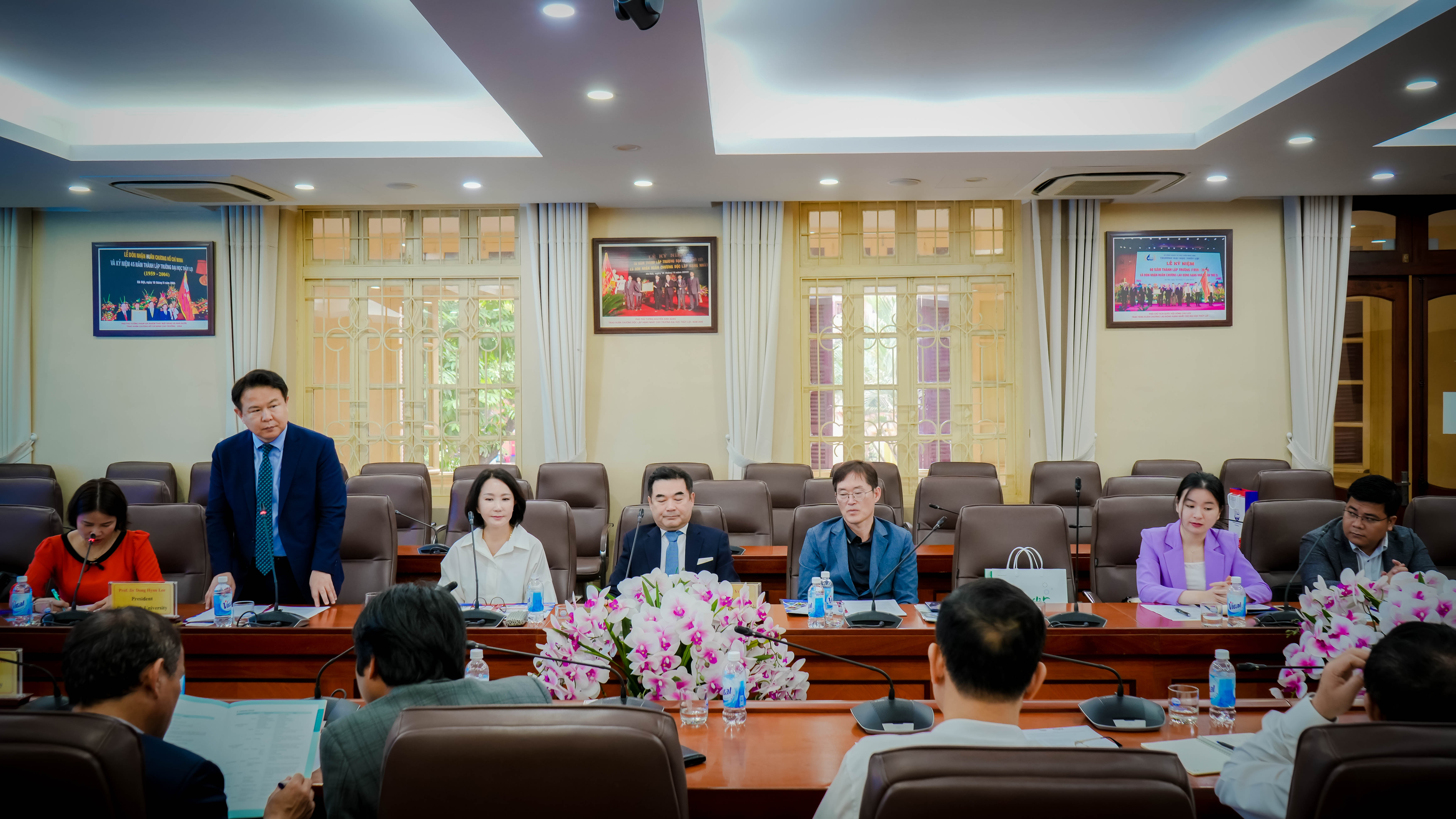 Phát biểu tại buổi lễ ký kết, GS.TS Trịnh Minh Thụ – Hiệu trưởng đã giới thiệu đôi nét về Nhà trường cũng như bày tỏ kỳ vọng về những kết quả của hợp tác trong tương lai. Theo Giáo sư, các nội dung trong ký kết hợp tác sẽ hỗ trợ nhà trường trong việc nâng cao việc giảng dạy tiếng Hàn Quốc và dự kiến mở ngành ngôn ngữ Hàn Quốc để Trường ĐHTL phấn đấu là một trường đa ngành và cũng đóng góp vào sự phát triển chung của Trường ở các lĩnh vực đang là thế mạnh. Ngoài ra, GS Trịnh Minh Thụ cũng mong muốn triển khai chương trình trao đổi giảng viên, sinh viên, tài liệu ấn phẩm khoa học, cùng tổ chức hội thảo, seminar,