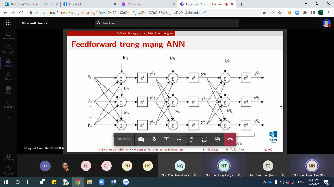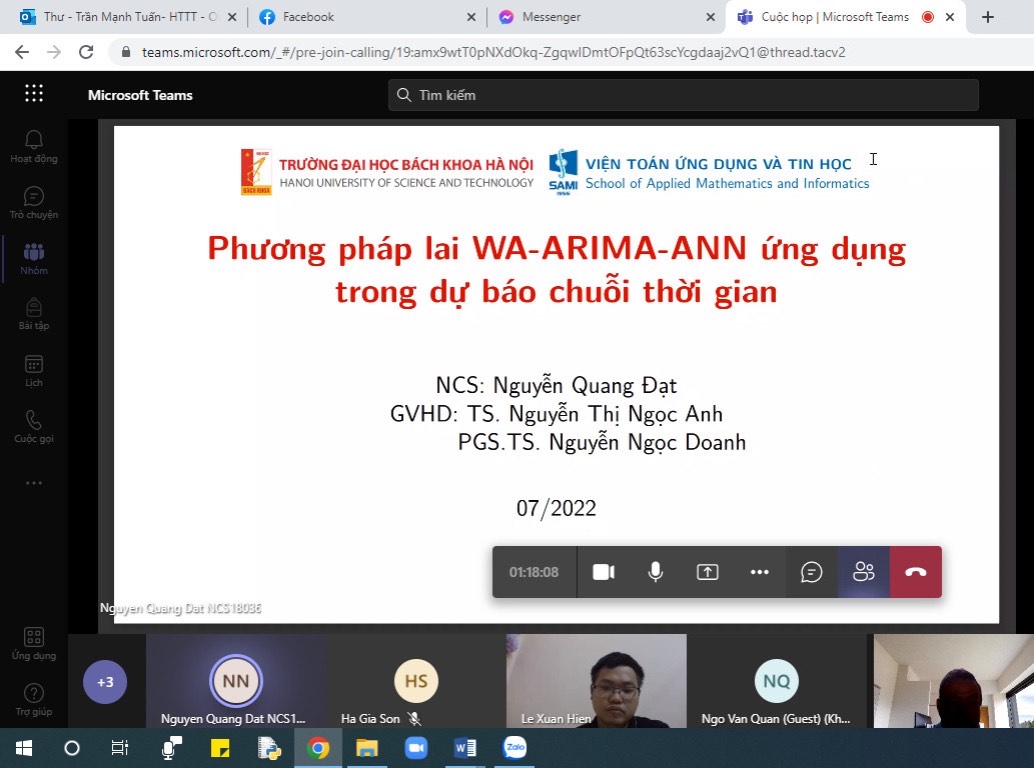 Tại hội thảo ngày 06/8/2022, nhóm AICOST (Trí tuệ nhân tạo cho biến đổi khí hậu và điều khiển hệ thống/Artificial Intelligence for Tackling Climate Change and Controlling System) đã tổ chức thành công hội thảo với 03 bài tham luận do ThS. Nguyễn Quang Đạt; PGS.TS. Nguyễn Ngọc Doanh như sau: (1) Mô hình lai ARIMA-ANN dùng trong dự báo chuỗi thời gian; (2) Mô hình lai sử dụng Seasonal, Online ARIMA và Online RNN dự báo phụ tải điện ngắn hạn; (3) Online SARIMA ứng dụng trong dự báo ngắn hạn phụ tải điện. Qua 03 bài tham luận trên cho thấy, các kết quả nghiên cứu của nhóm AICOST tập trung vào một số điểm chính sau đây: