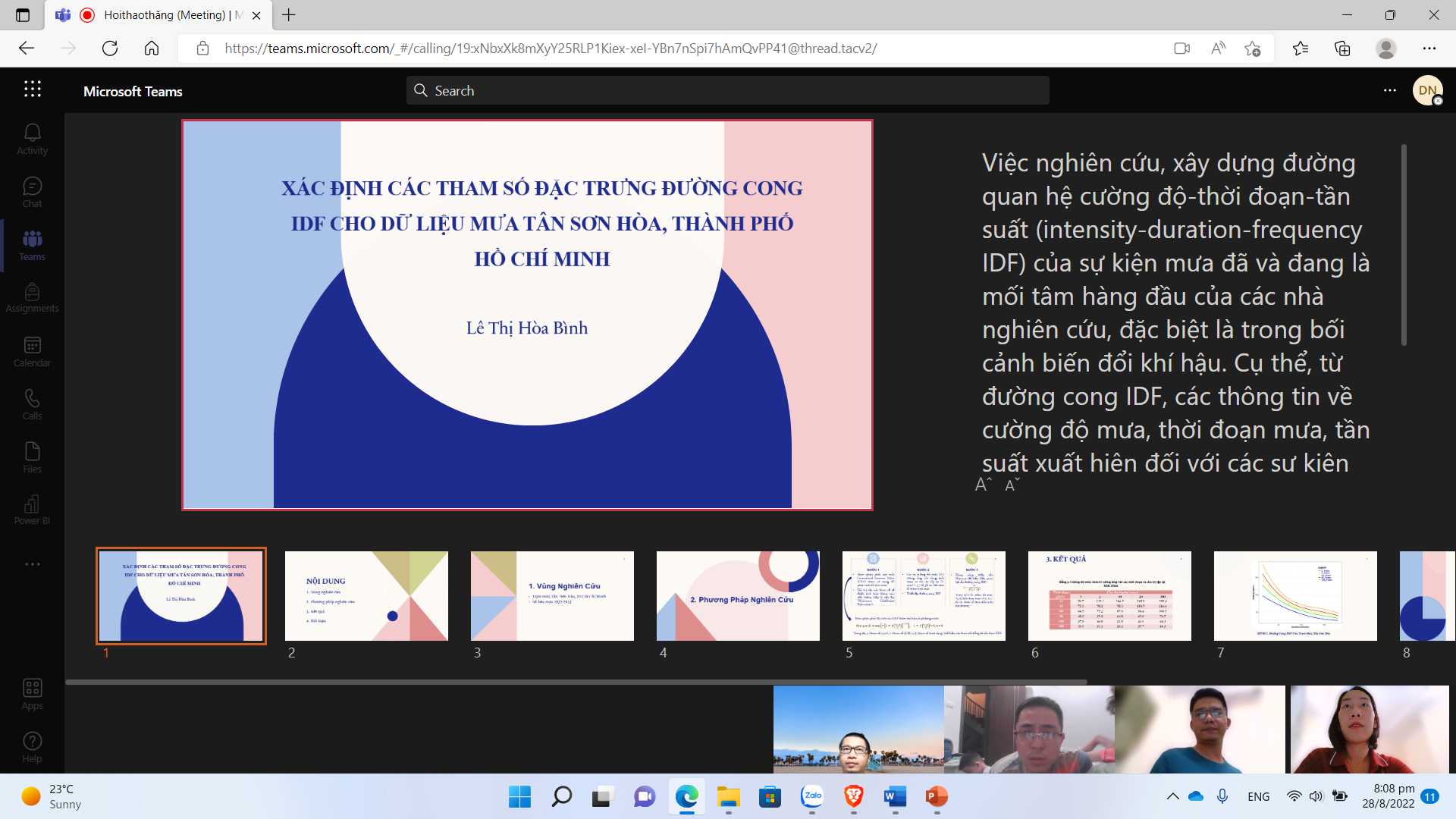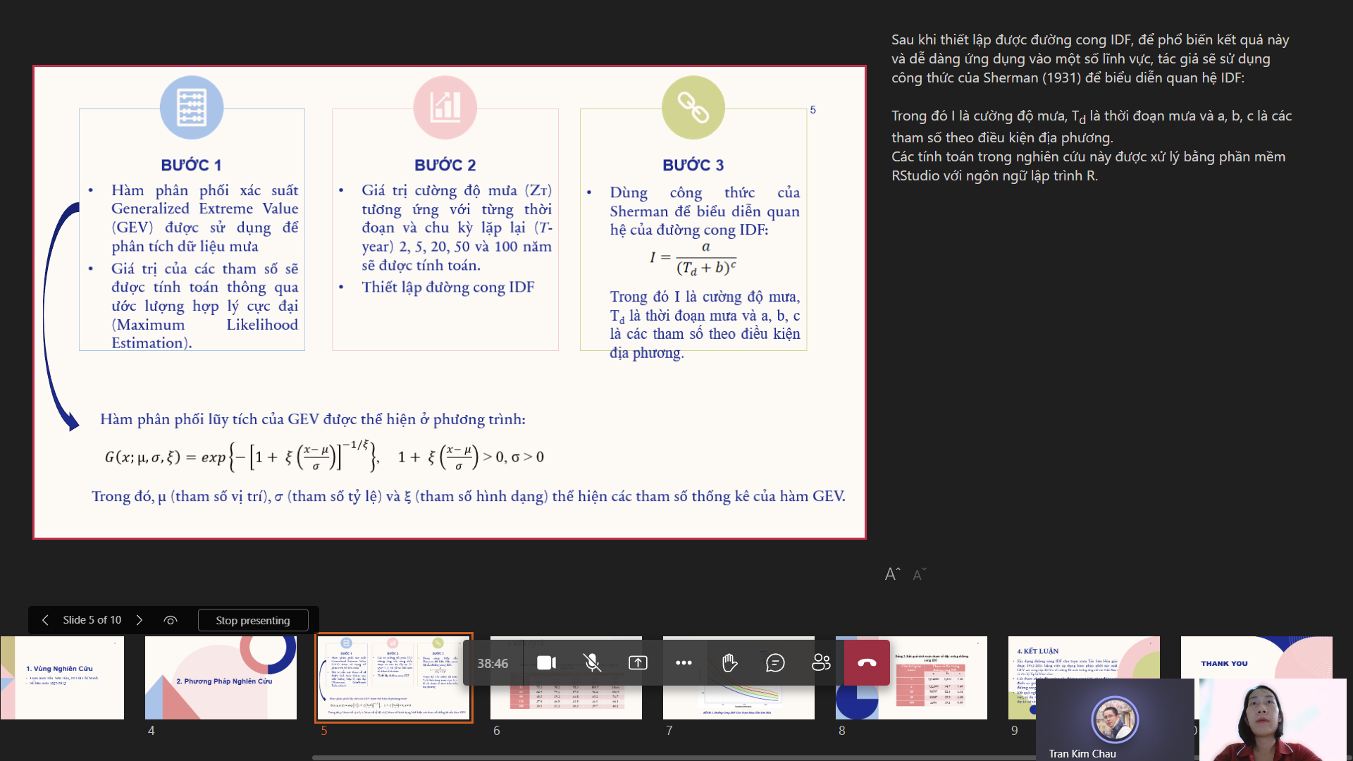 Tương tự, ngày 28/8/2022 nhóm GRAT (Ứng dụng GIS và viễn thám/GIS and Remote sensing Application) đã tổ chức thành công hội thảo với chủ đề “Xác định các tham số đặc trưng đường cong IDF cho dữ liệu mưa Tân Sơn Hòa, TP. Hồ Chí Minh” do TS. Lê Thị Hòa Bình trình bày. Nghiên cứu này xác định việc xác định đường cong IDF là mối quan tâm hàng đầu trong việc thiết kế hệ thống thoát nước đô thị; hiện nay có khá nhiều công thức biểu diễn mối quan hệ IDF, trong đó công thức của Sherman được sử dụng khá phố biến. Từ kết quả nghiên cứu đã đạt được, nhóm nghiên cứu đã đưa ra đề xuất: sử dụng công thức của Sherman và đề xuất các tham số địa phương phù hợp. Kết quả nghiên cứu có thể áp dụng vào các lĩnh vực quy hoạch, thiết kế các dự án cơ sở hạ tầng.