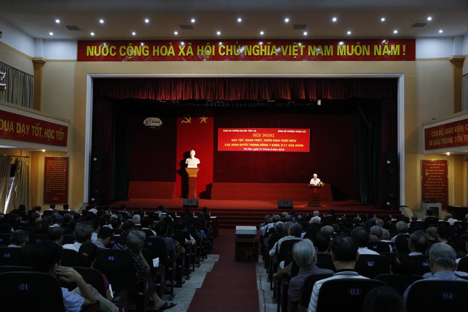 Hội nghị học tập, quán triệt, triển khai thực hiện các Nghị quyết Trung ương 7 khóa XII của Đảng diễn ra tại Trường Đại học Thủy lợi đã thành công tốt đẹp. Đây là việc làm thường niên của Đảng bộ Trường kết hợp cùng Đảng bộ phường Trung Liệt nhằm đưa nghị quyết của Đảng, chủ trương, chính sách của Nhà nước đến với từng Đảng viên. Sau mỗi đợt học tập chính trị mỗi Đảng viên sẽ có một bài thu hoạch về những kiến thức bản thân đã thu nhận được. Đây cũng là một dịp để mỗi Đảng viên nâng cao nhận thức cá nhân để xây dựng khối đoàn kết trong chi bộ, Đảng bộ nơi mình đang sinh hoạt.