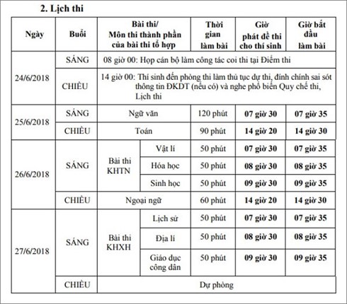 So với năm 2017, lịch thi năm nay muộn hơn 3 ngày. Ngày thi đầu tiên 25/6, thí sinh sẽ làm bài hai môn Văn, Toán. Ngày tiếp theo, các em làm bài thi Khoa học tự nhiên và Ngoại ngữ. Sáng 27/6, thí sinh sẽ thi nốt bài thi Khoa học xã hội.