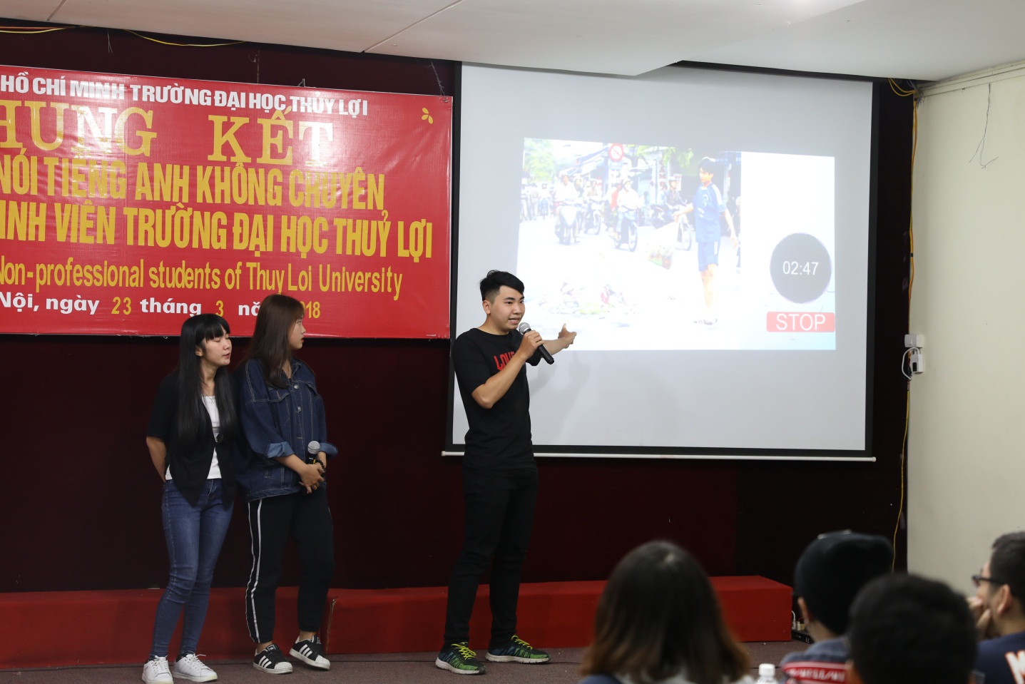 Tham dự đêm chung kết có GS. TS Nguyễn Trung Việt – Phó hiệu trưởng Nhà trường; TS Nguyễn Đình Trinh – Bí thư đoàn trường; đại diện ĐTN – HSV, bộ môn tiếng Anh cùng các bạn sinh viên toàn trường.