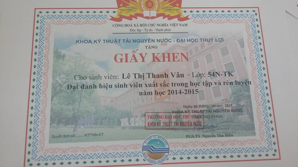 Xin chúc cho cô sinh viên Khoa Kĩ Thuật Tài Nguyên Nước- Lớp 54NTK- Lê Thị Thanh Vân luôn mạnh khỏe và đạt được nhiều thành công.