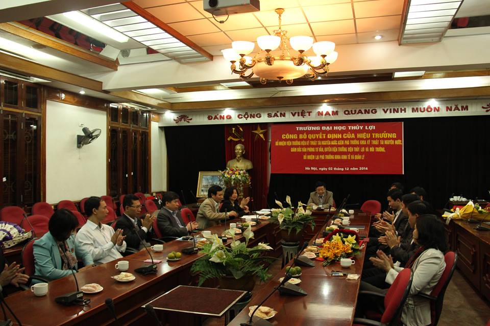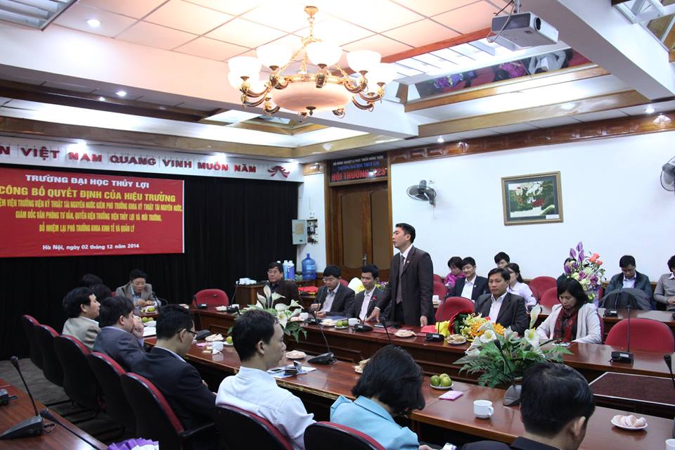 Sáng nay 02/12/2014, tại hội trường 223 nhà A1 trường Đại học Thủy Lợi đã long trọng tổ chức buổi công bố Quyết định bổ nhiệm Viện trưởng Viện Kỹ thuật Tài nguyên nước kiêm Phó trưởng khoa Kỹ thuật Tài nguyên nước cho TS Lê Văn Chín – Phó viện trưởng Viện Kỹ thuật Tài nguyên nước kiêm Phó trưởng bộ môn Kỹ thuật và Quản lý tưới; Giám đốc văn phòng Tư vấn cho TS Đinh Thế Mạnh- Phó Giám đốc Văn phòng tư vấn thẩm định thiết kế và giám định chất lượng công trình. Quyền Viện trưởng Viện Thủy Lợi & Môi trường cho ThS Lê Xuân Bảo – Phó Viện trưởng Viện Thủy Lợi và Môi trường. Bổ nhiệm lại Phó trưởng Khoa Kinh tế và Quản lý cho PGS.TSKH Nguyễn Trung Dũng.