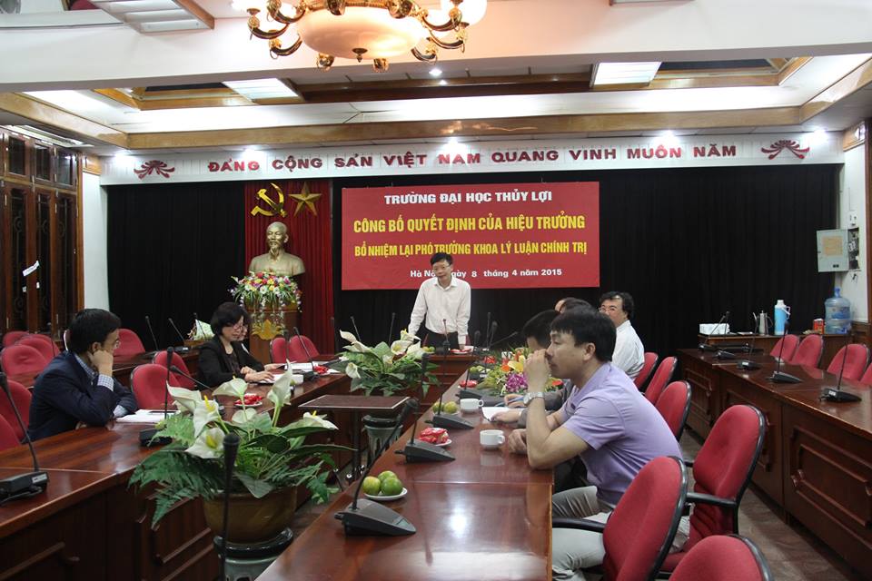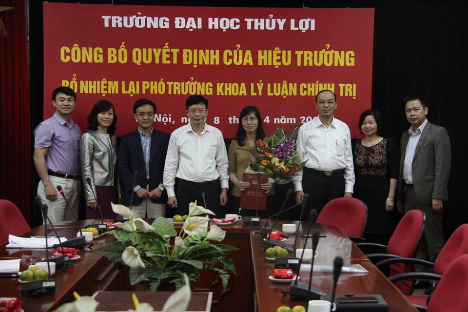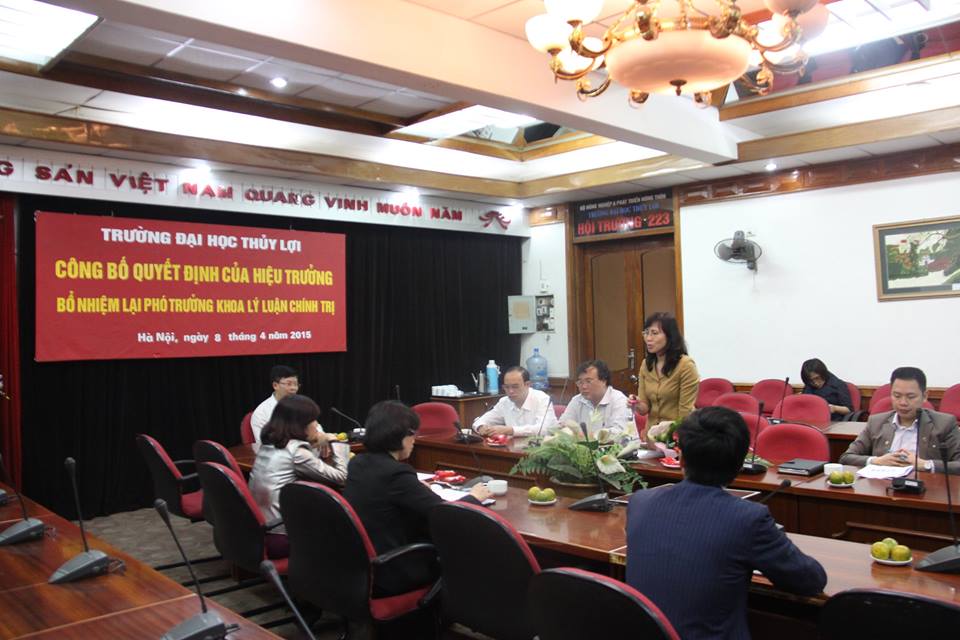 Sáng ngày 8/4/2015, tại phòng 223/A1, trường Đại học Thủy lợi đã tổ chức buổi công bố Quyết định bổ nhiệm lại Phó trưởng khoa Lý luận chính trị đối với GVC.ThS.Nguyễn Thị Phương Mai. Đến dự có GS.TS.Nguyễn Quang Kim – Bí thư Đảng ủy – Hiệu trưởng nhà trường, GS.TS.Trịnh Minh Thụ – Phó hiệu trưởng nhà trường, PGS.TS.Lê Xuân Roanh – Chủ tịch Công đoàn trường, cùng các đồng chí đại diện cho các phòng, khoa, ban, Đoàn thanh niên đã có mặt trong buổi công bố quyết định này.