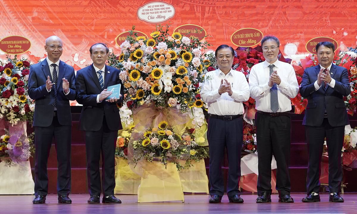 Phó Chủ tịch Quốc hội Lê Minh Hoan chúc mừng tân Hiệu trưởng Nguyễn Trung Việt