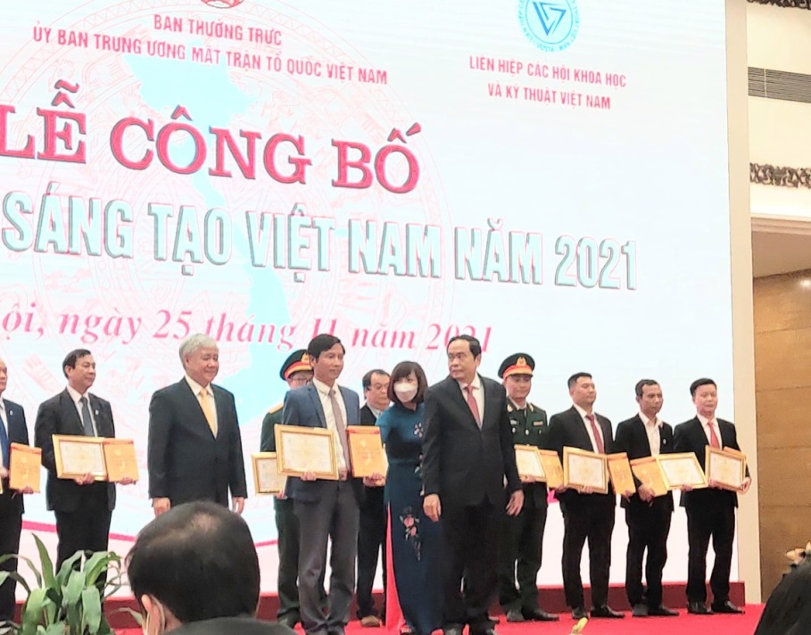 TS. Vũ Ngọc Thương (giảng viên khoa Cơ khí, người đứng chính giữa) đồng chủ nhiệm công trình đón nhận giải thưởng tại buổi Lễ công bố Sách vàng Sáng tạo Việt Nam năm 2021
