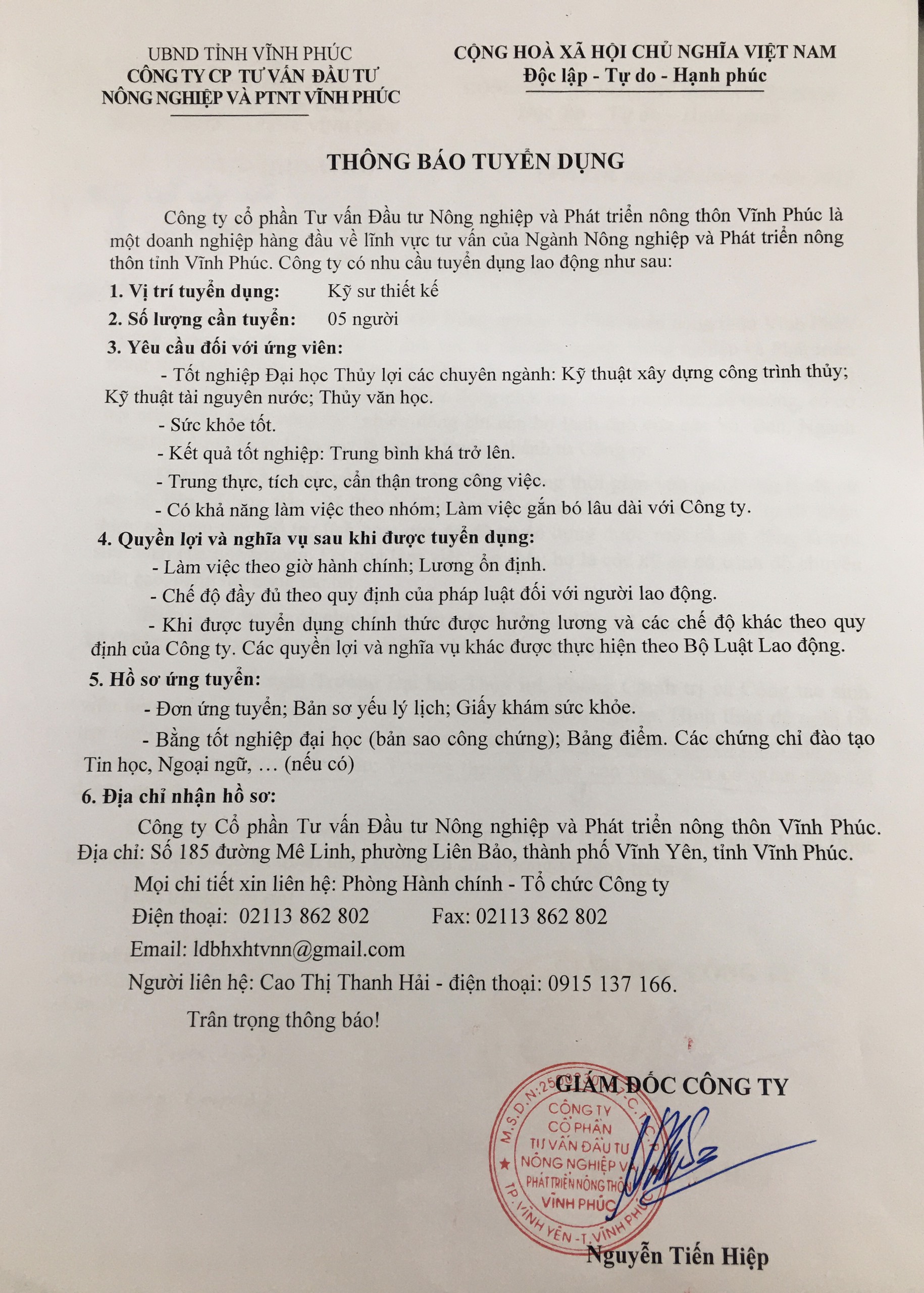 Công ty cố phần tư vấn đầu tư Nông nghiệp và Phát triển nông thôn Vĩnh Phúc là doanh nghiệp hàng đầu về lĩnh vực tư vấn của Ngành Nông nghiệp và Phát triển nông thôn tỉnh Vĩnh Phúc có trụ sở tại 185 đường Mê Linh, Liên Bảo, Vĩnh Yên, Vĩnh Phúc đang có nhu cầu tuyển dụng 05 kỹ sư thiết kế.