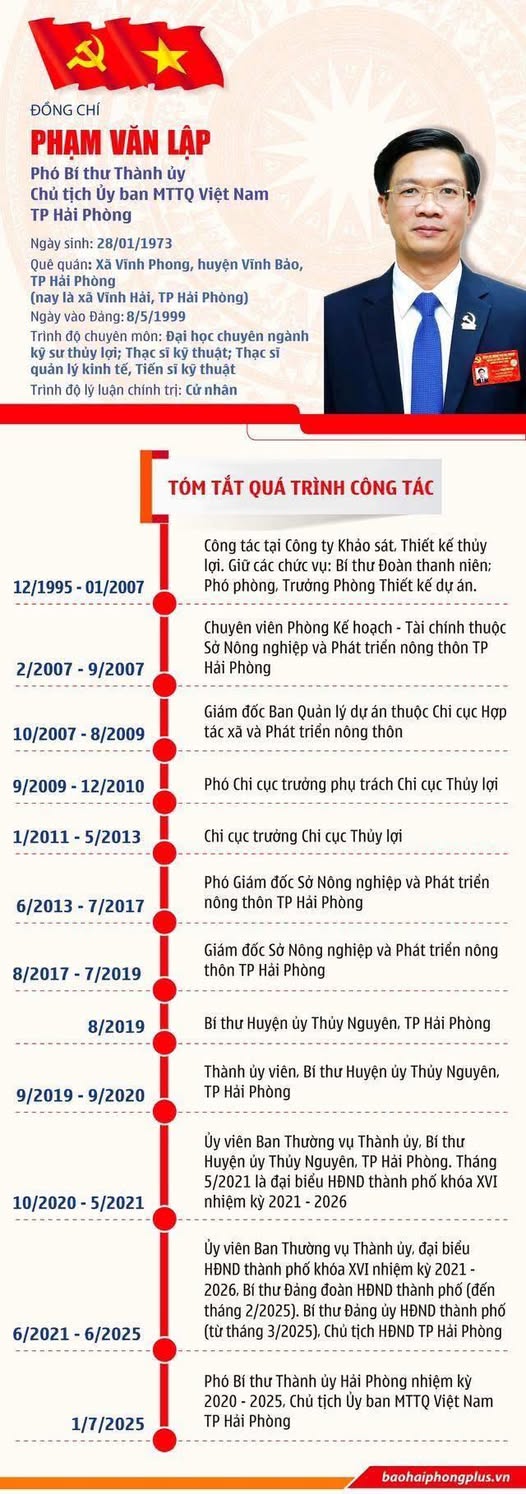Theo đó, Ông Phạm Văn Lập sinh năm 1973, quê quán tại xã Vĩnh Phong, huyện Vĩnh Bảo, Hải Phòng được chỉ định giữ chức Chủ tịch Ủy ban MTTQ Việt Nam TP Hải Phòng (mới). Ông Lập là cựu sinh viên lớp 32Đ ngành Công trình thủy điện, Khoa Công trình của Trường Đại học Thủy lợi. Ông đã hoàn thành đào tạo bậc Tiến sĩ tại Trường với đề tài “Nghiên cứu vận tốc dòng chảy do sóng tại chân kè nông trong thiết kế chân kè đá đổ, áp dụng cho kè đê biển Cát Hải, Hải Phòng” vào tháng 6/2019.