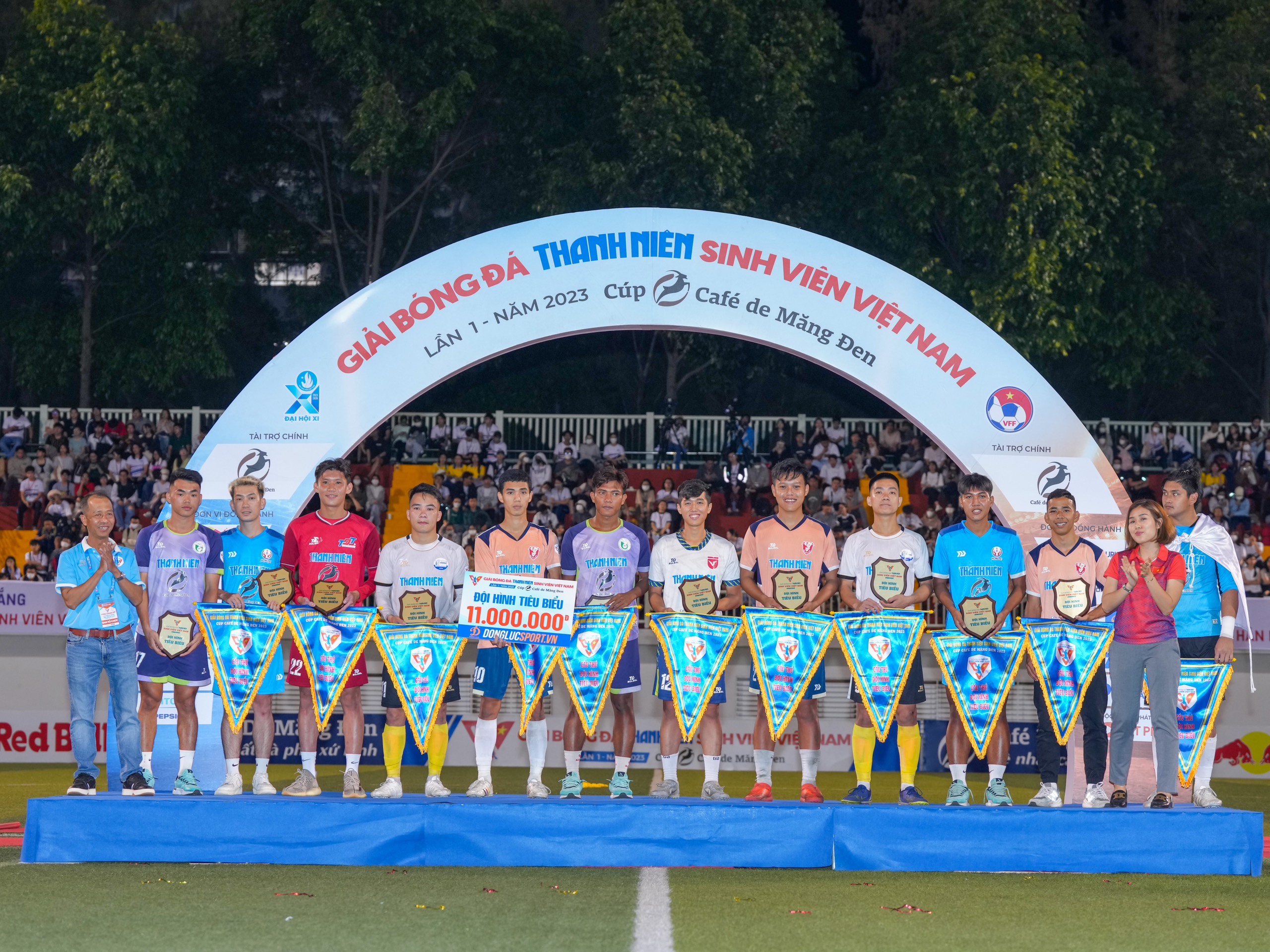 ĐH Thủy lợi vinh dự có 2 cầu thủ được vào đội hình tiêu biểu của giải đấu Nguyễn Hoàng Danh (thứ 5 từ trái sang) và Lê Tiến Duy (thứ 5 từ phải sang)