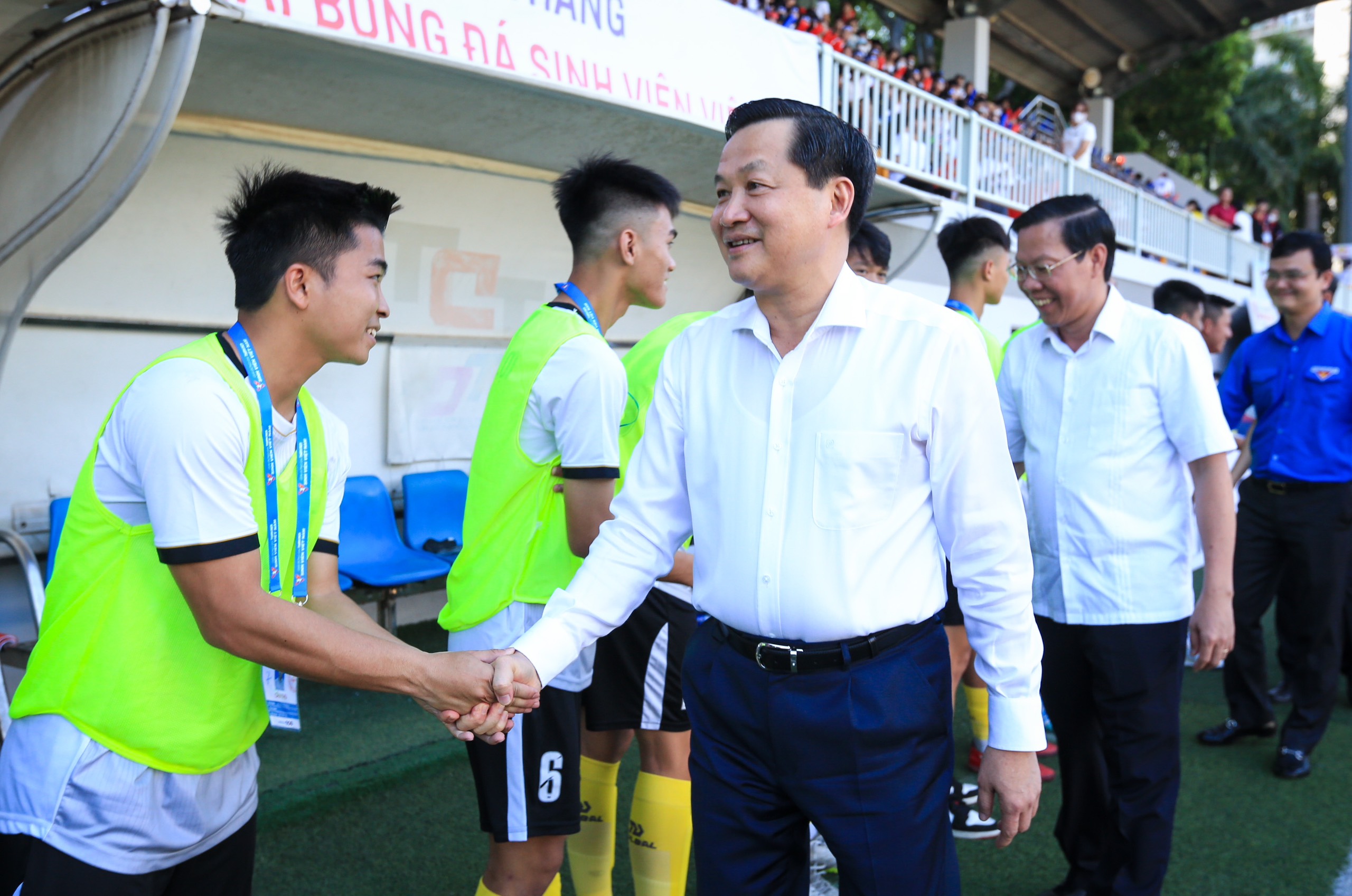 Phó Thủ tướng Lê Minh Khái động viên Đội tuyển Bóng đá Trường Đại học Thủy lợi trước giờ bóng lăn