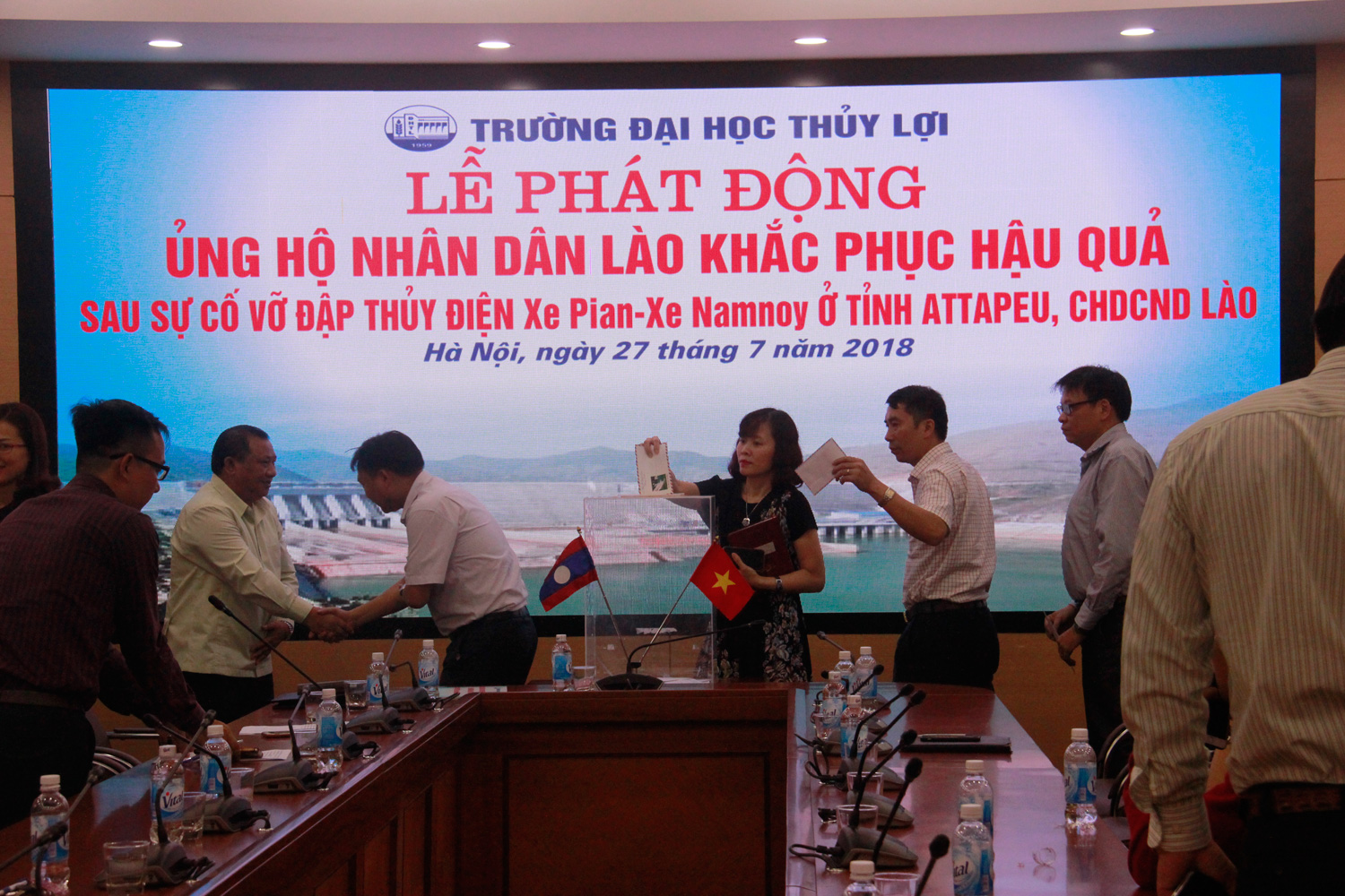 Để chia sẻ những tổn thất mà sự cố vỡ đập thủy điện vừa gây ra đối với dân tộc Lào và cùng chia sẻ những kiến thức bổ trợ cho các bạn khi đang học tại ngôi trường chuyên đào tạo cán bộ trực tiếp thiết kế, thi công, vận hành những công trình tương tự, ngày 27/7/2018 Trường Đại học Thủy lợi tổ chức buổi gặp mặt lưu học sinh Lào và trao ủng hộ nhân dân Lào anh em vượt qua giai đoạn khó khăn.