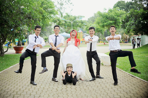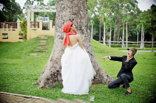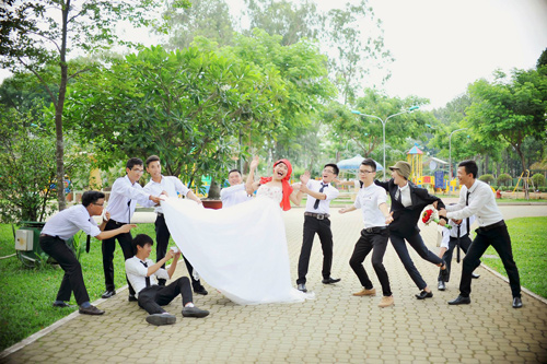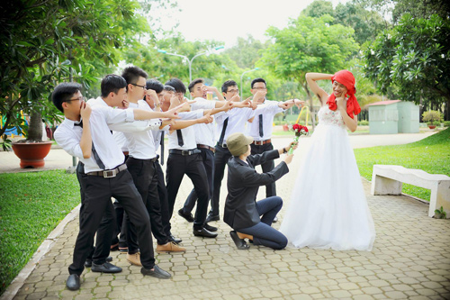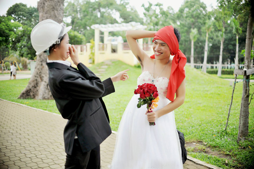 Hai nhân vật chính trong bộ ảnh là Nguyễn Tuấn (đóng vai cô dâu) và Mỹ Hoa (đóng vai chú rể). Ý tưởng nam giả nữ cũng khiến cho bộ ảnh thêm phần thú vị.