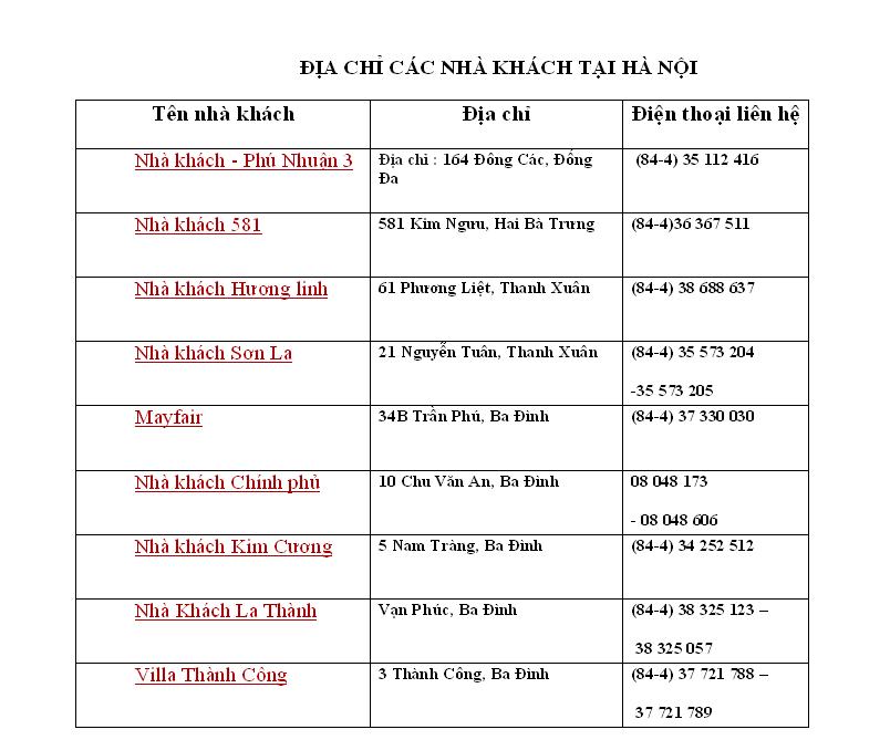 15 | Khách sạn Kim Anh Địa chỉ: 132 Tôn Đức Thắng, Q. Đống Đa Điện thoại: 3823 1291 Fax: 3845 9122 | 40 | Khách sạn Nam Đế Địa chỉ: 14A Lý Nam Đế, Q. Ba Đình Điện thoại: 3823 2484 Fax: 3733 1989 |