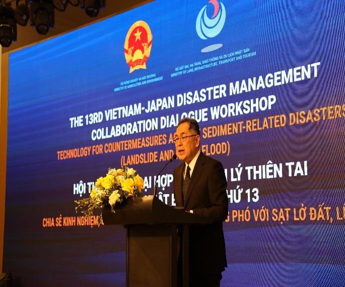 Phát biểu tại Hội thảo ông Shin ISHIKAWA – Thư ký – Bộ trưởng Bộ Đất đai, Hạ tầng, Giao thông và Du lịch Nhật Bản ông cho biết: Hội thảo Đối thoại hợp tác quản lý thiên tai Việt Nam-Nhật Bản lần thứ 13 được tổ chức hàng năm dựa trên thỏa thuận đã được Bộ trưởng hai nước ký kết. Hội thảo lần thứ 12 đã được tổ chức vào tháng 11/2024. Hội thảo hôm nay sẽ trao đổi ý kiến về chủ đề cụ thể và rất kịp thời là “các biện pháp phòng chống sạt lở đất” trong khuôn khổ “tăng cường hợp tác trong lĩnh vực phòng chống thiên tai”. Ông Shin ISHIKAWA tin rằng đây sẽ là cuộc trao đổi có ý nghĩa và quan trọng.