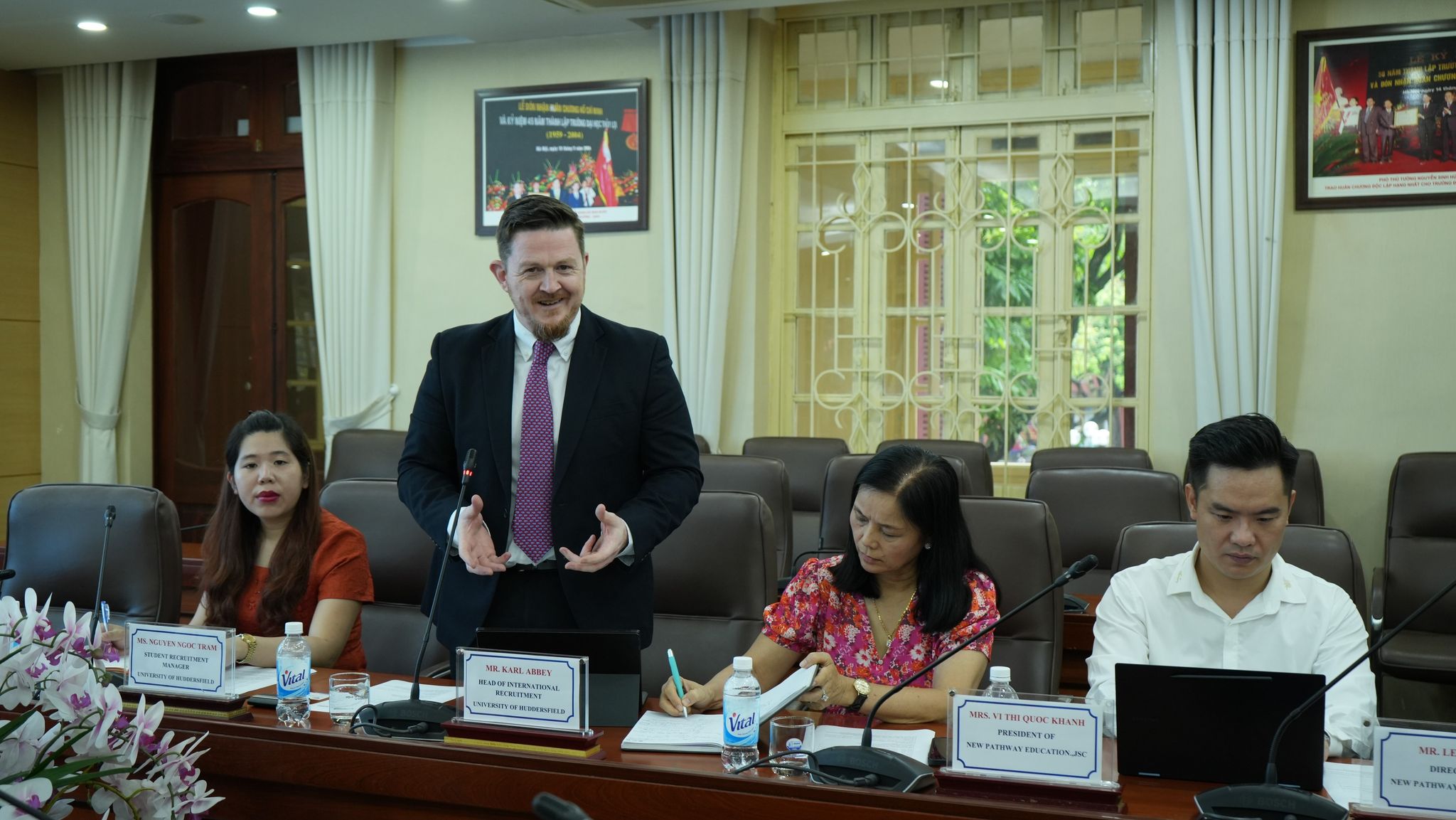 Tại buổi làm việc, GS. TS Trịnh Minh Thụ phát biểu chào mừng đoàn ĐH Huddersfield và cảm ơn các bên đã tích cực trao đổi hợp tác đào tạo trong khuôn khổ nội dung MOU đã được kí kết. Là một trường Đại học tổng hợp gồm nhiều khoa như: Kinh tế, Máy tính, Kỹ sư, Khoa học, Kiến trúc và môi trường xây dựng…, đây là cơ hội rất thuận lợi cho sinh viên của Trường Đại học Thủy lợi được chuyển tiếp sang Đại học Huddersfield học tiếp và nhận bằng cử nhân hoặc thạc sĩ của Đại học Huddersfield với nhiều học bổng hấp dẫn như Chương trình 2+2, 3+1 hay 3+1+1 (học thêm một năm sau đại học để nhận bằng Thạc sỹ) cùng nhiều ưu đãi khi sinh viên sang du học tại Huddersfield. ĐH Huddersfield có liên kết chặt chẽ với nhiều doanh nghiệp để hỗ trợ cho sinh viên tìm kiếm cơ hội trải nghiệm thực tế vì vậy việc vừa học vừa làm là một cơ hội rất tốt cho sinh viên khi học tại Hudderfield.