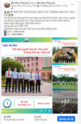 Triển khai từ đầu tháng 11, Cuộc thi ảnh “Nét đẹp người cán bộ, viên chức Trường Đại học Thủy lợi” đã nhận được 20 tác phẩm dự thi ở hạng mục ảnh tập thể và 22 ảnh dự thi ở hạng mục ảnh cá nhân.