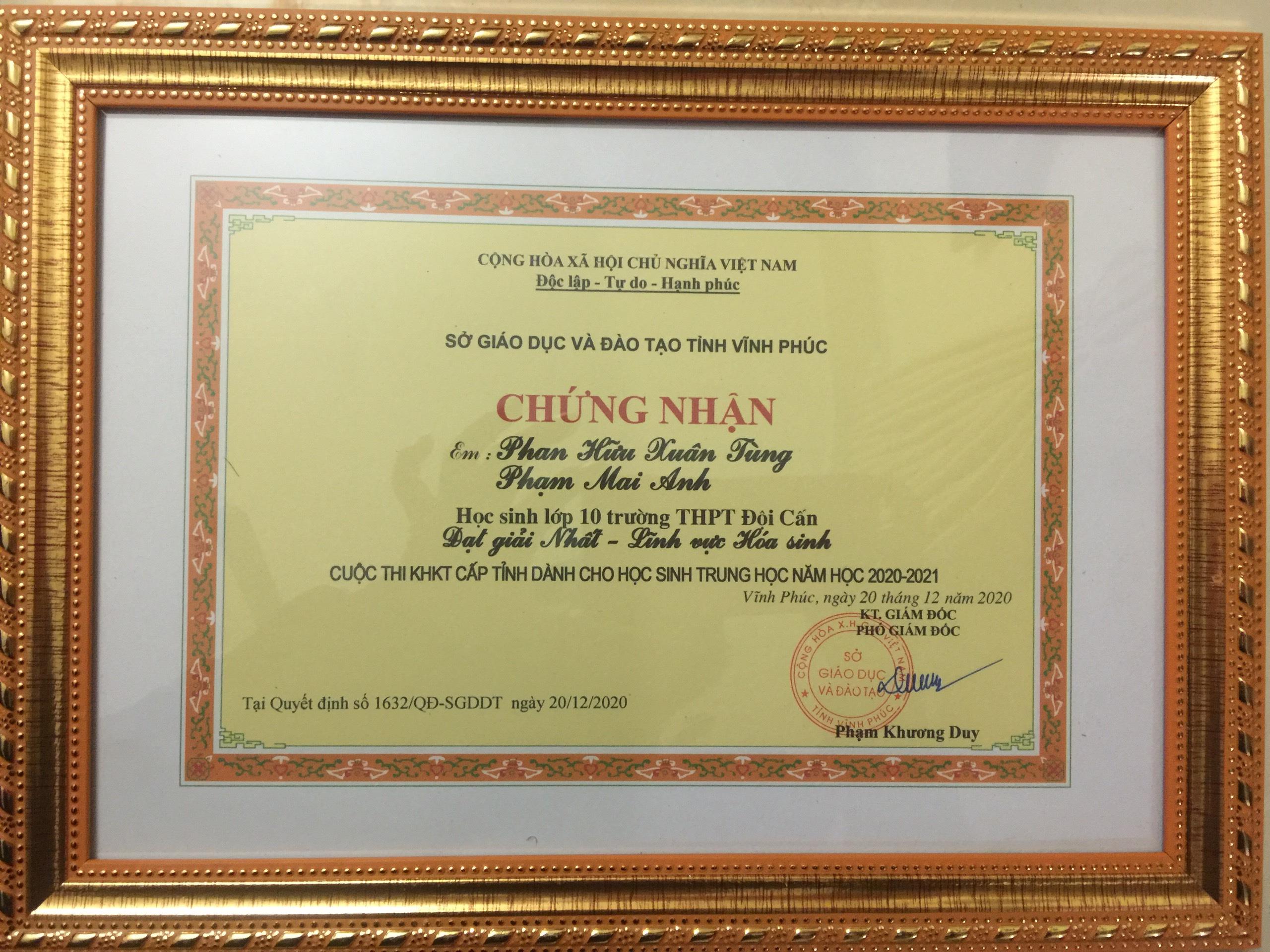 Hai em xuất sắc giành giải Nhất cấp tỉnh lĩnh vực Hóa sinh giành cho khối học sinh phổ thông trung học.