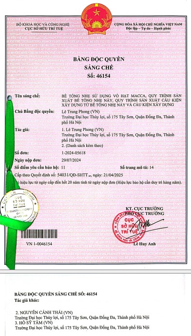 1. “Bê tông nhẹ sử dụng vỏ hạt mắc ca, quy trình sản xuất bê tông nhẹ này, quy trình sản xuất cấu kiện xây dựng từ bê tông nhẹ này và cấu kiện xây dựng” –  Bằng độc quyền sáng chế số 46154 theo quyết định số 54301/QĐ-SHTT ngày 21/04/2025.