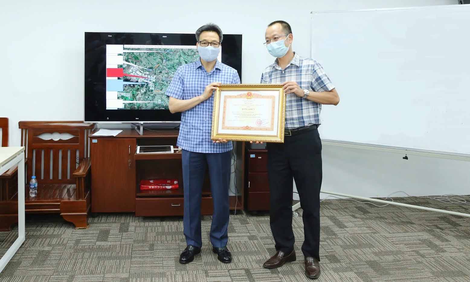 Ngoài ra, Phó Thủ tướng cũng trao Bằng khen của Thủ tướng chính phủ cho Ông Nguyễn Thế Trung, Chủ tịch HĐQT Công ty cổ phần công nghệ DTT đã tham gia thiết lập và tổ chức Tổ Thông tin đáp ứng nhanh; thiết kế và hỗ trợ triển khai các ứng dụng công nghệ thông tin chống dịch: NCOVI, Khaibaoyte; thiết lập diễn đàn 300 nhà khoa học về dịch tễ và công nghệ thông tin, xây dựng các mô hình phân tích, dự báo, mô phỏng chống dịch; chủ trì báo cáo tính nguy cơ rủi ro về dịch của các tỉnh, thành trên toàn quốc.