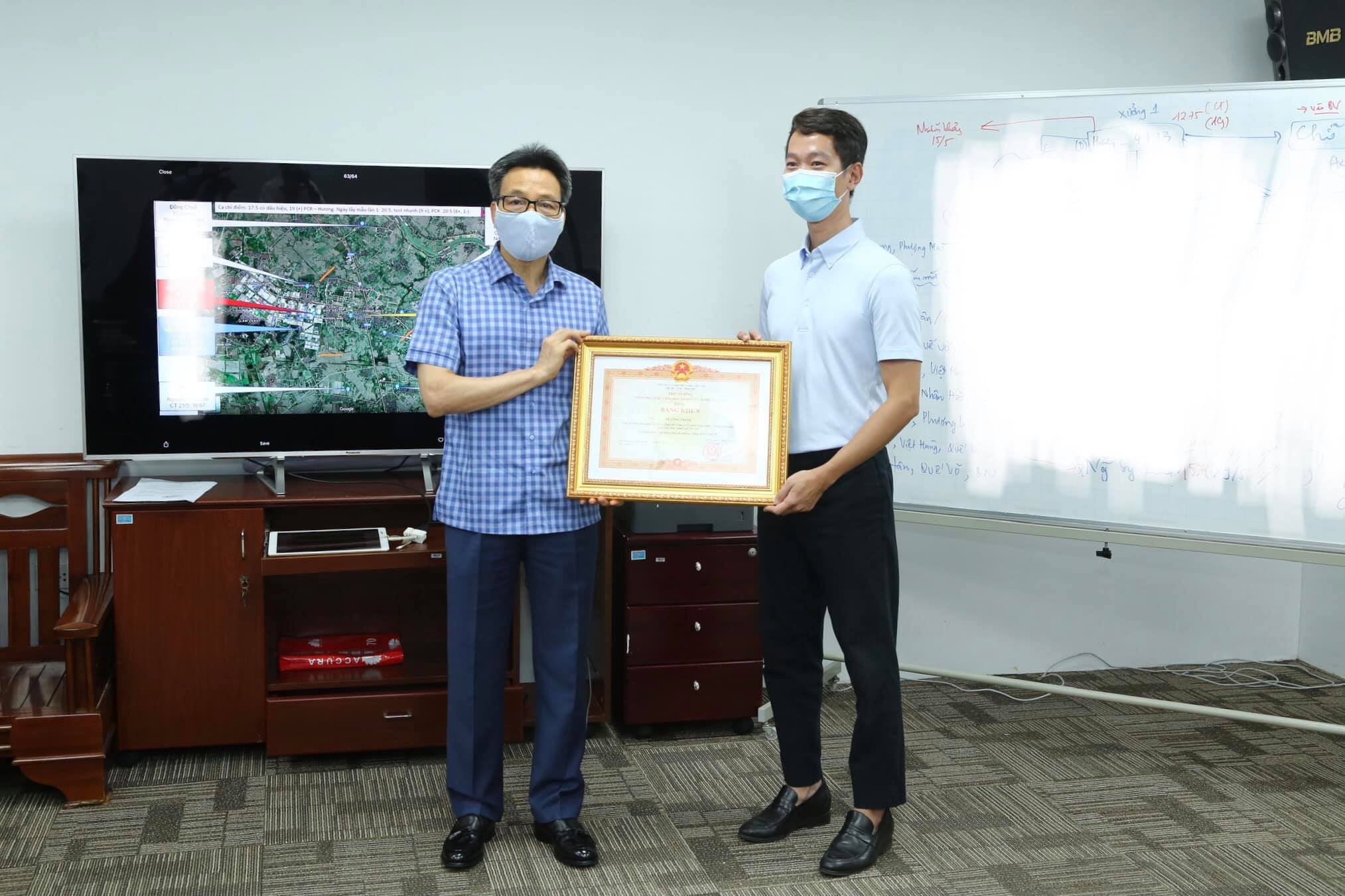 Ngoài ra, Phó Thủ tướng cũng trao Bằng khen của Thủ tướng chính phủ cho Ông Nguyễn Thế Trung, Chủ tịch HĐQT Công ty cổ phần công nghệ DTT đã tham gia thiết lập và tổ chức Tổ Thông tin đáp ứng nhanh; thiết kế và hỗ trợ triển khai các ứng dụng công nghệ thông tin chống dịch: NCOVI, Khaibaoyte; thiết lập diễn đàn 300 nhà khoa học về dịch tễ và công nghệ thông tin, xây dựng các mô hình phân tích, dự báo, mô phỏng chống dịch; chủ trì báo cáo tính nguy cơ rủi ro về dịch của các tỉnh, thành trên toàn quốc.