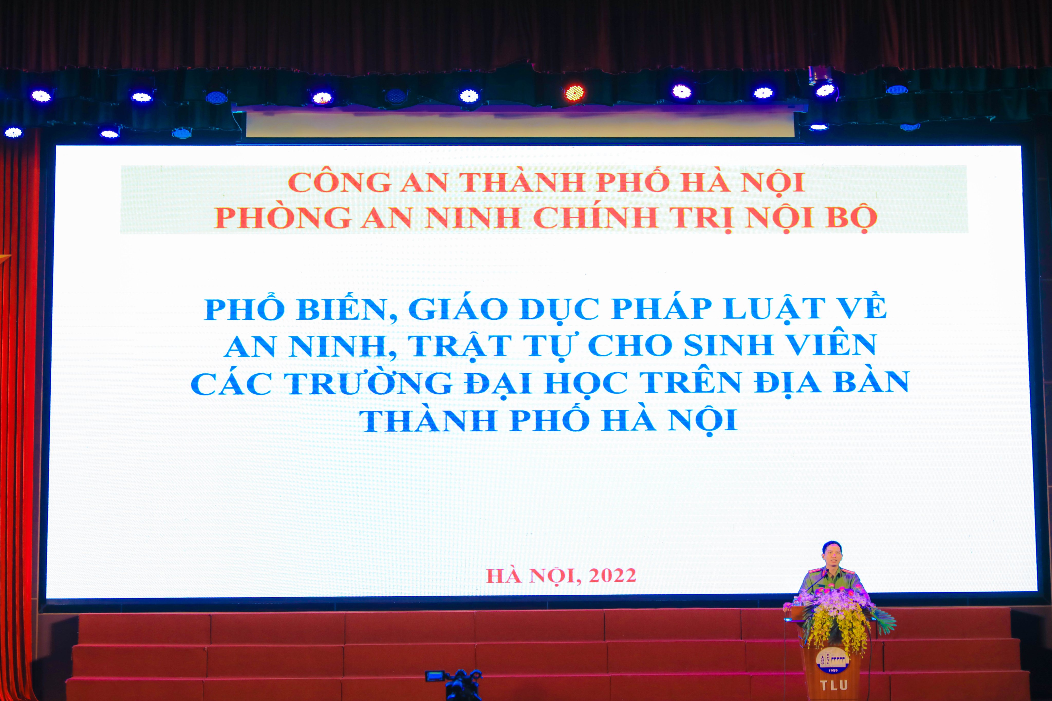 Tại hội nghị, Đại úy Nguyễn Văn Trọng – Cán bộ phòng PA03 Công an thành phố Hà Nội đã phổ biến, giáo dục pháp luật đến sinh viên Nhà trường về tình hình an ninh chính trị, trật tự an toàn trên địa bàn Thủ đô. Đồng chí nêu rõ: Trường Đại học Thủy lợi và chính các bạn sinh viên cần lưu ý, cảnh giác đối với những vấn đề liên quan trực tiếp đến đối tượng sinh viên như: không tham gia các hoạt động hội nhóm, câu lạc bộ tổ chức bất hợp pháp, trái pháp luật; lên án các hành vi như học hộ, thi hộ, làm giả giấy tờ, văn bằng chứng chỉ… trong học tập và thi cử. Đồng thời, phát hiện và tố giác các đối tượng sử dụng kiến thức khoa học để vi phạm pháp luật hoặc sử dụng trình độ công nghệ thông tin để tấn công mạng, đăng tải các thông tin sai sự thật, trái với chủ trương, chính sách của Đảng, pháp luật của Nhà nước trên không gian mạng…
