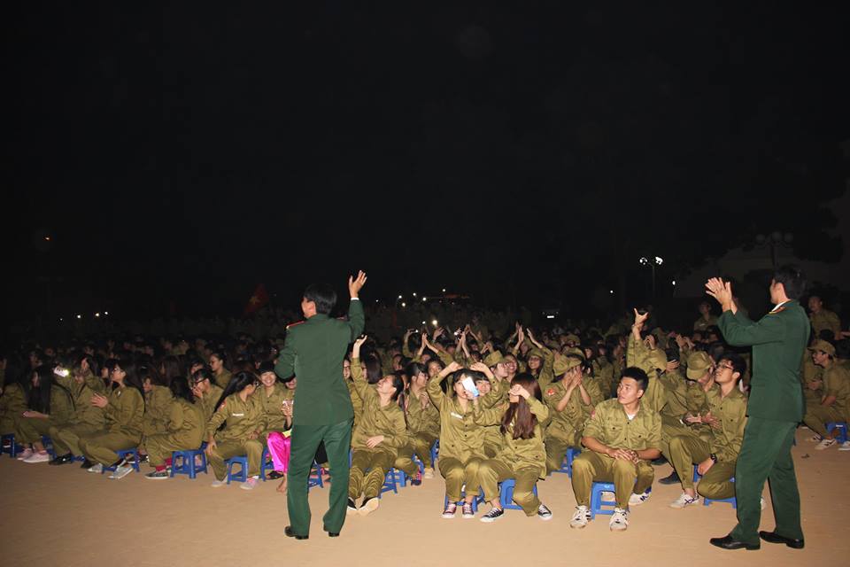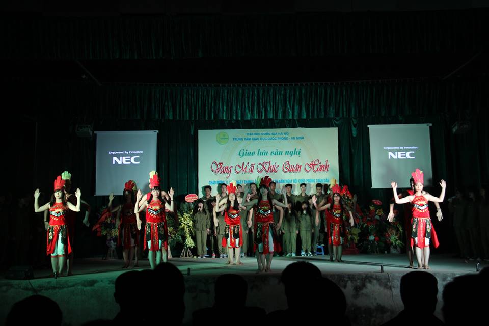 Đêm giao lưu được mở màn bằng âm hưởng vui tươi, sôi động của ca khúc “ Rạng rỡ Việt Nam” qua sự thể hiện của tốp ca và đội múa của các bạn tân sinh viên K57. Người xem lần lượt đi hết cung bậc cảm xúc này đến cảm xúc khác với những ca khúc đi cùng năm tháng gắn bó với hai cuộc kháng chiến trường kỳ chống Pháp và chống Mỹ của dân tộc như ca khúc “ Chiếc gậy Trường Sơn” , “ Trường Sơn Đông – Trường Sơn Tây”, “ Bài ca không quên”, “ Dòng máu lạc hồng”. Không chỉ có sự góp mặt của các bạn sinh viên, các sỹ quan của Trung tâm GDQP – AN Đại học Quốc gia Hà Nội cũng có những tiết mục biểu diễn hết sức ấn tượng qua các nhạc phẩm đậm chất lính như ca khúc “ Nơi đảo xa” , “ Tổ quốc gọi tên mình” được các bạn sinh viên hưởng ứng cổ vũ rất nhiệt tình. Đặc biệt hơn, chương trình giao lưu văn nghệ “ Vang mãi khúc quân hành” còn có sự góp mặt của các ca sĩ, vũ công đến từ đội văn nghệ trường Đại học Thuỷ lợi mang lời ca tiếng hát để gửi những lời chúc mừng tốt đẹp nhất tới các đồng chí là cán bộ, giảng viên của Trung tâm GDQP – AN Đại học Quốc gia Hà Nội nhân ngày vui hôm nay.