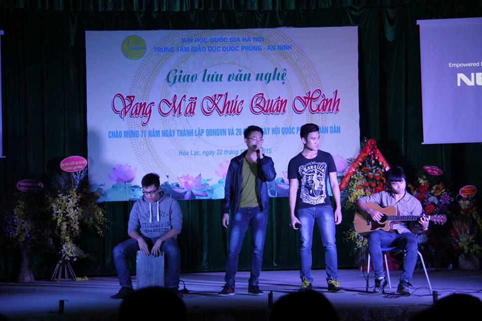 Nằm trong chuỗi các hoạt động kỷ niệm 71 năm ngày thành lập Quân đội Nhân dân Việt Nam và 26 năm Ngày hội quốc phòng toàn dân, tối ngày 22/12/2015, Trung tâm giáo dục Quốc phòng – An ninh Đại học Quốc gia Hà Nội đã tổ chức chương trình giao lưu văn nghệ “ Vang mãi khúc quân hành” do các bạn sinh viên khoá 57 trường Đại học Thuỷ lợi đang theo học khoá học Giáo dục quốc phòng – An ninh tại trung tâm thể hiện. Tới dự và cổ vũ cho đêm giao lưu văn nghệ có: ThS. Nguyễn Văn Lợi – Giám đốc trung tâm GDQP – AN Đại học Quốc gia Hà Nội, Đại tá: Trần Danh Lực – Bí thư chi bộ, Phó Giám đốc trung tâm, ThS. Nguyễn Ngọc Ánh – Phó trưởng phòng Công tác Chính trị và Quản lý sinh viên trường Đại học Thuỷ Lợi, TS. Nguyễn Đình Trinh – Bí thư Đoàn trường Đại học Thuỷ lợi cùng các đồng chí là cán bộ, giảng viên và đông đảo 1427 tân sinh viên khoá 57 Đại học Thuỷ lợi đang học tập tại Trung tâm.