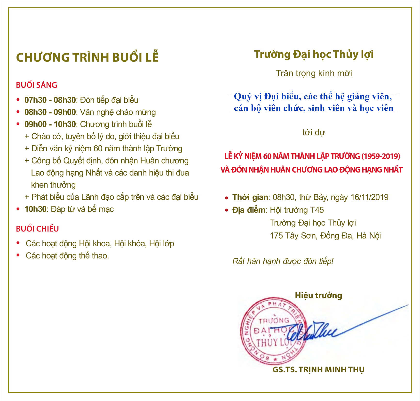 Giấy mời dự “Lễ kỷ niệm 60 năm thành lập trường (1959-2019) và đón nhận Huân chương lao động Hạng Nhất” Đăng vào 25 Tháng 10, 2019 bởi Data OldTheo Dõi Trường Đại Học Thủy Lợi Trên Chuỗi sự kiện kỷ niệm 60 năm thành lập Trường Đại học Thủy lợi (1959-2019).Đẩy mạnh công tác phát triển Đảng viên trong các cơ sở giáo dục Bài viết cùng chủ đề: Trường Đại học Thủy lợi triển khai nhiệm vụ năm học 2025–2026: Tăng cường đổi mới, nâng cao chất lượng đào tạo trong bối cảnh mới Phương và hành trình vươn tới ước mơ Trường Đại học Thủy lợi tiếp đón đoàn doanh nghiệp tỉnh Ehime (Nhật Bản) Kế hoạch bổ nhiệm, bổ nhiệm lại chức danh Giáo sư, Phó giáo sư năm 2025 Đại học Thủy lợi thắng thuyết phục 2–0, hiên ngang tiến vào bán kết NUC Cup TV360 Trường Đại học Thủy lợi tiếp tục thúc đẩy các nghiên cứu khuôn khổ dự án Mekong Delta Living Lab với Đại học Công nghệ Delft (TU- Delft, Hà Lan) Đội tuyển bóng đá giành 9 điểm tuyệt đối, hiên ngang tiến vào Top 8 đội mạnh nhất toàn quốc Nghiên cứu xây dựng bộ công cụ phục vụ đánh giá, dự báo biến động hình thái và giải pháp ổn định bãi biển vùng Trung Trung Bộ