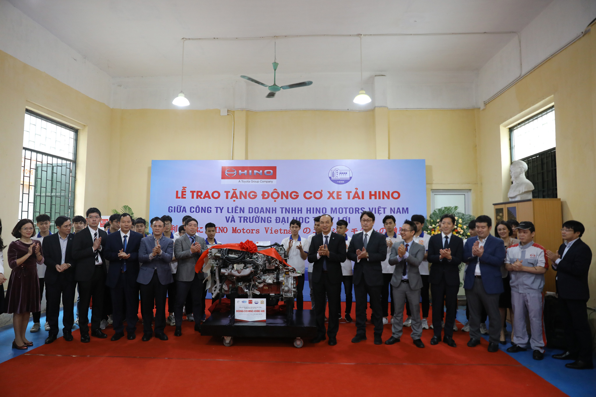 Giáo sư Hiệu trưởng cùng bày tỏ sự cảm ơn đến công ty Hino trong việc tài trợ cho sinh viên Nhà trường một động cơ xe phục vụ cho việc thực hành, thực tập ngay tại Trường.