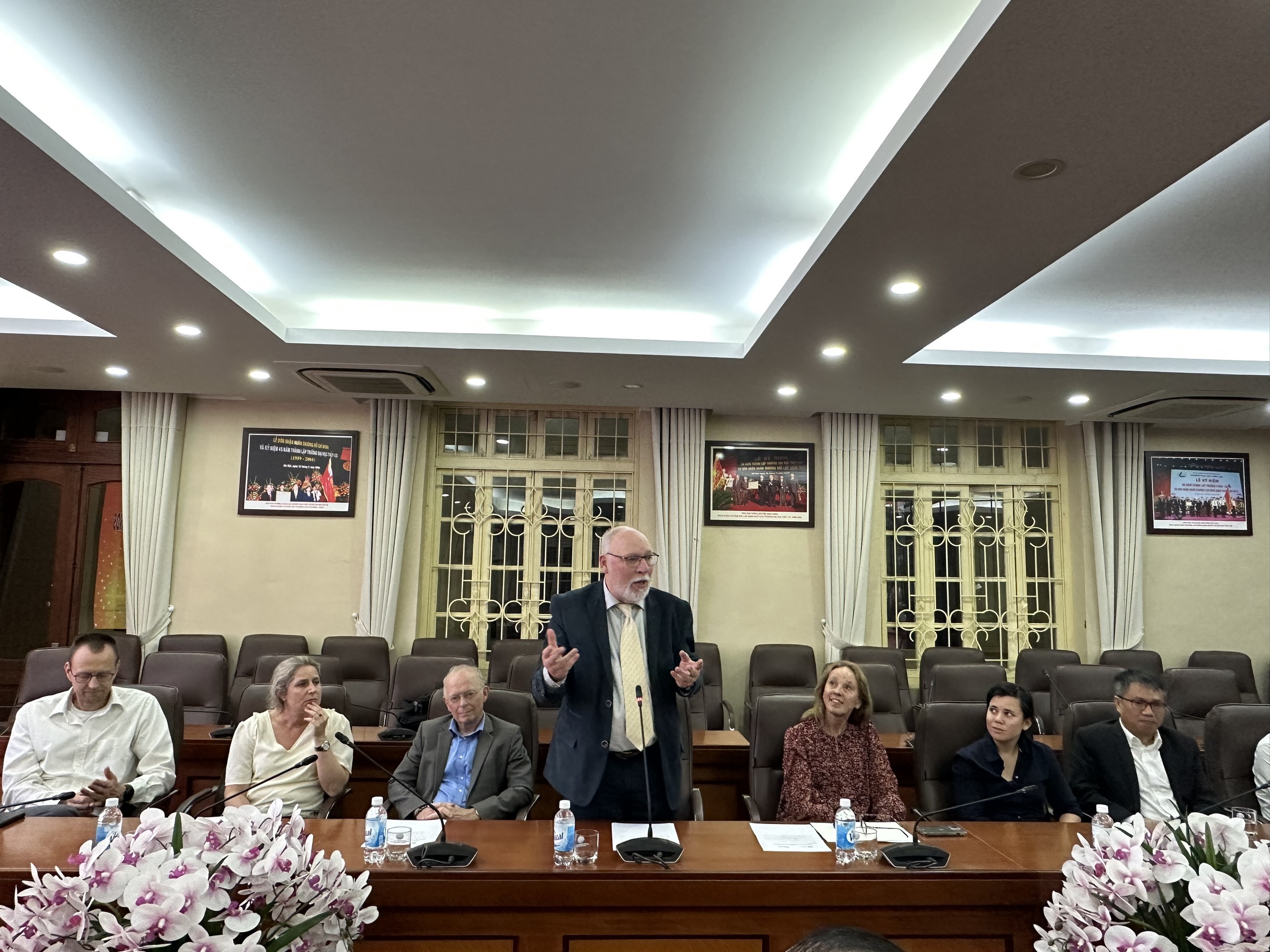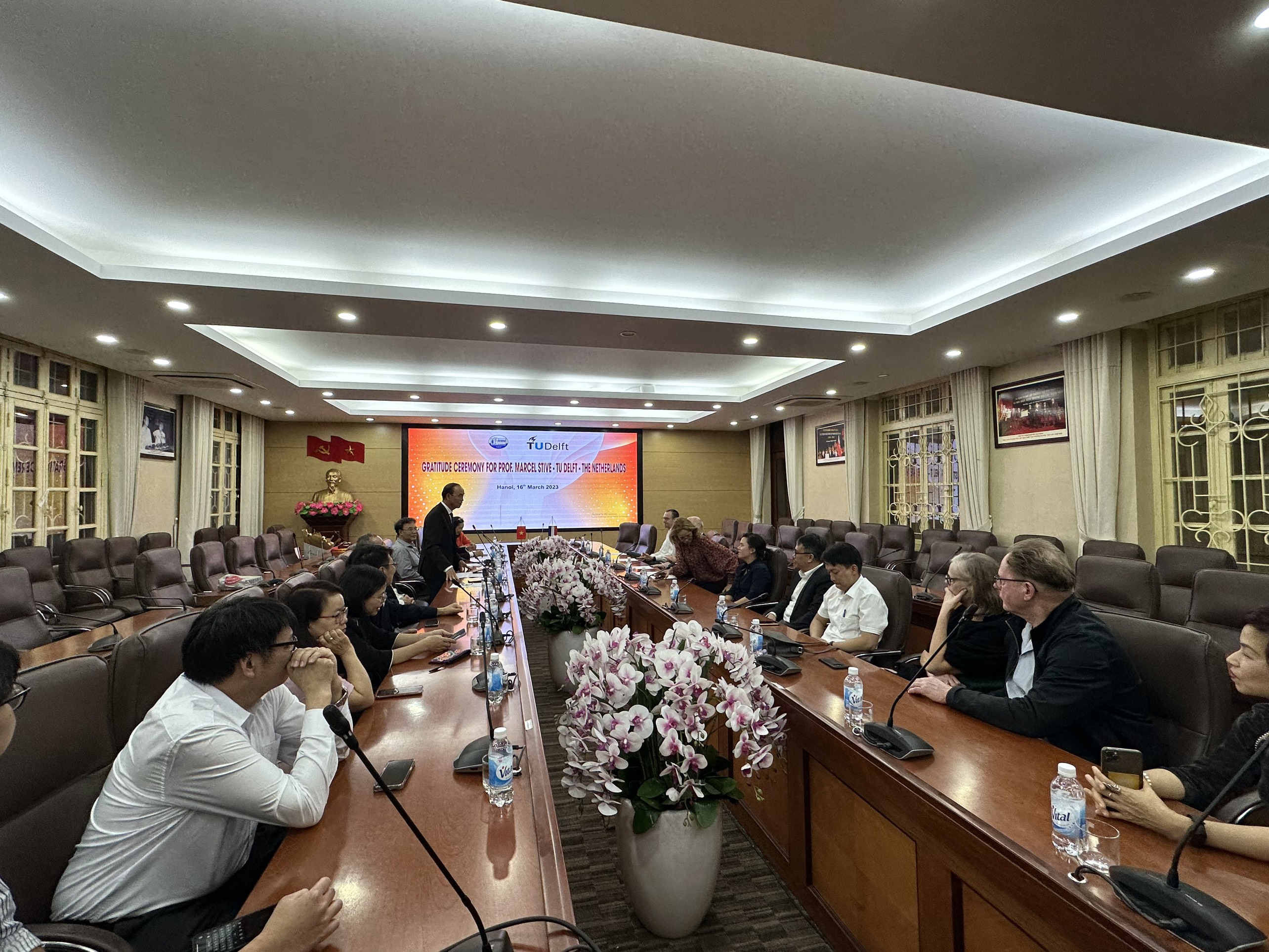 Trong khuôn khổ lễ tổng kết dự án diễn ra vào chiều 16/3, Nhà Trường đã tổ chức lễ tri ân GS. Marcel Stive, ĐH TUDelft, Hà Lan. GS. Marcel Stive là một nhà khoa học nổi tiếng thế giới, có uy tín cao trong cộng đồng khoa học với hơn 40 năm kinh nghiệm nghiên cứu và tư vấn trong các dự án thuộc lĩnh vực kỹ thuật bờ biển. Ông được coi là “cha đẻ” của công trình “Động cơ Cát” (Sand Motor) và đã nhận được nhiều danh hiệu cao quý như Honorary Doctorate từ Lund University, Sweden (2012); the Order of the Dutch Lion (2013); the Coastal Sediments Award (2014); hay the ASCE Coastal Award (2015).
