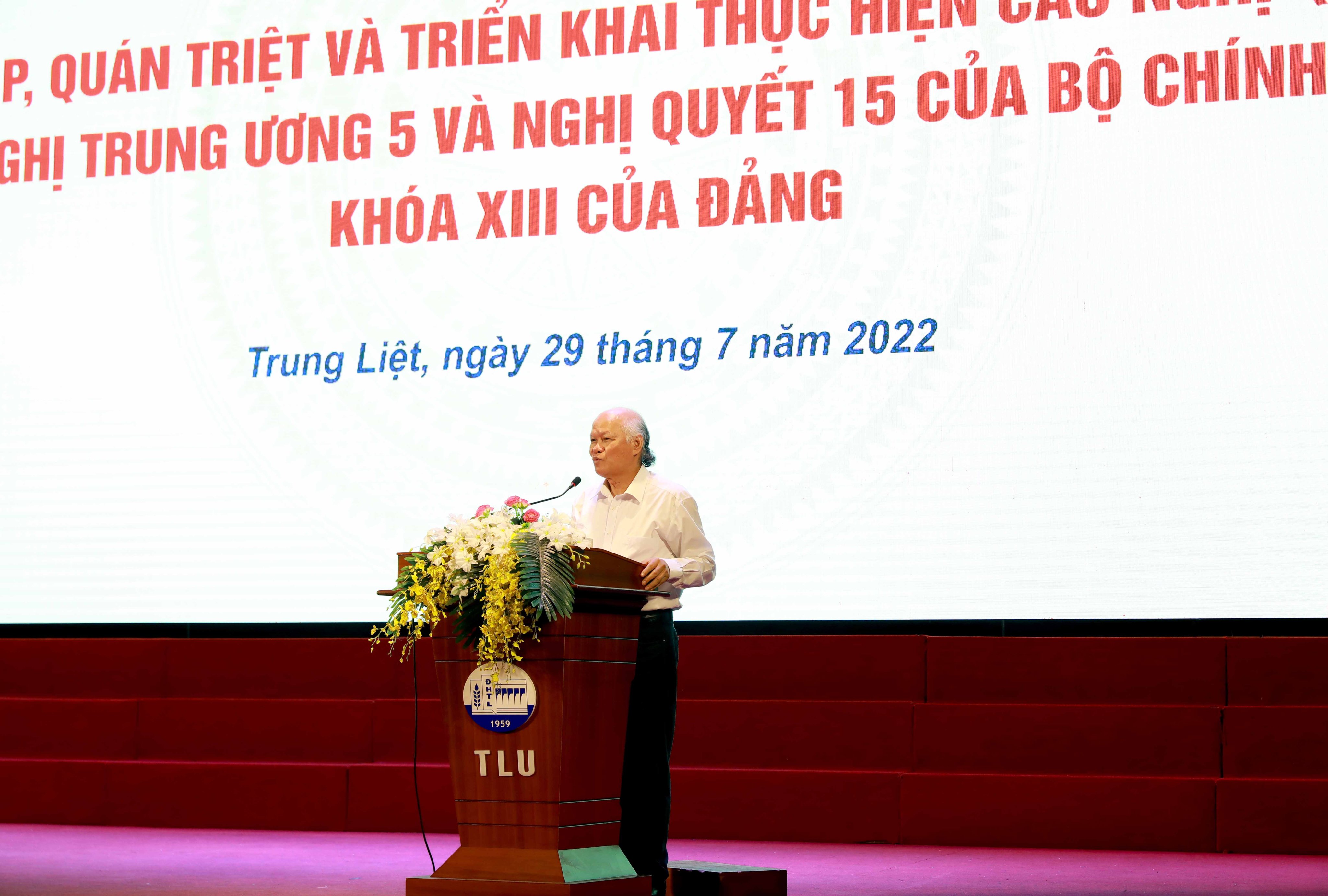 Trong 3 tiếng buổi sáng, Hội nghị đã lắng nghe đồng chí Phạm Xuân Thâu – Phó trưởng ban Tuyên giáo Trung ương Hội Cựu chiến binh Việt Nam trình bày nội dung chủ yếu của Nghị quyết số 15-NQ/TW của Bộ Chính trị về phương hướng, nhiệm vụ phát triển thủ đô Hà Nội đến năm 2030, tầm nhìn đến năm 2045. Báo cáo viên nêu rõ, trong từng giai đoạn, Thủ đô Hà Nội đều được Bộ Chính trị đặt ra yêu cầu phải xây dựng và phát triển thực sự xứng đáng là trung tâm đầu não chính trị – hành chính quốc gia, trái tim của cả nước; là trung tâm lớn về kinh tế, văn hóa, giáo dục và đảo tạo, khoa học và công nghệ và hội nhập quốc tế.