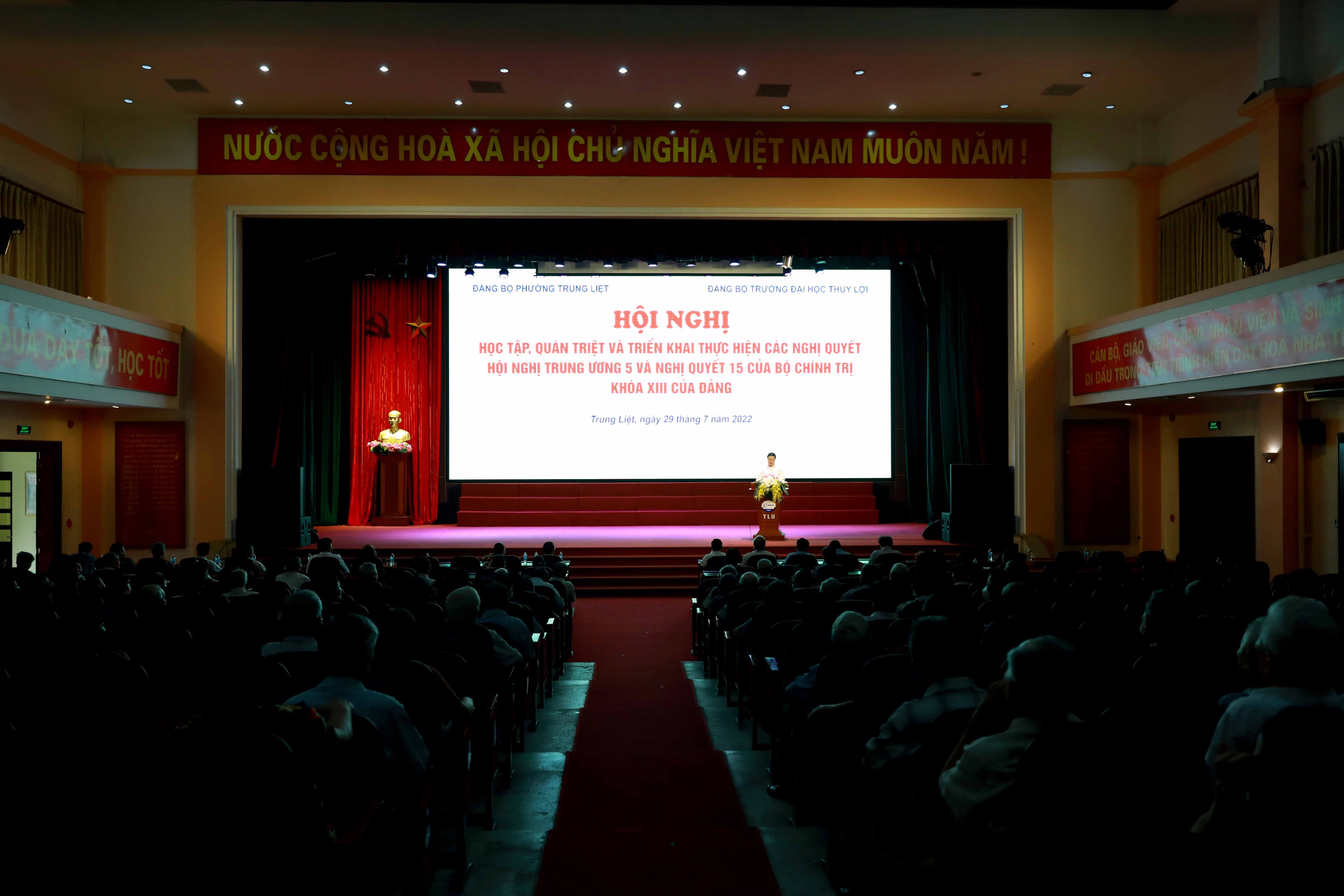 Về phía Trường Đại học Thủy lợi có GS.TS Nguyễn Quang Kim – Bí thư Đảng ủy – Chủ tịch Hội đồng Trường; PGS.TS Nguyễn Cảnh Thái – Phó Bí thư Đảng ủy, Phó Hiệu trưởng. Cùng với sự có mặt của các đảng viên thuộc 2 Đảng bộ phường Trung Liệt và Trường Đại học Thủy lợi. Hội nghị được dẫn dắt bởi báo cáo viên Phạm Xuân Thâu – Phó trưởng ban Tuyên giáo Trung ương Hội Cựu chiến binh Việt Nam.