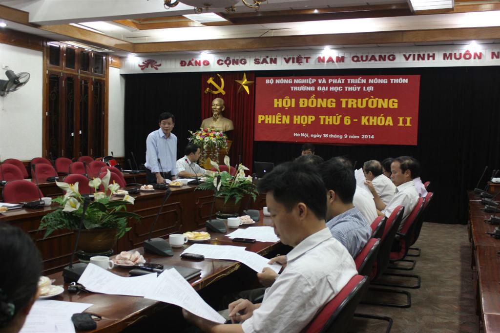 Nhằm rà soát lại các hoạt động của nhà trường trong thời gian qua và đánh giá các mặt đạt được và những mặt chưa đạt được qua đó đề ra giải pháp và phương hướng, nhiệm vụ cho năm mới. Ngày 18/9/2014, tại hội trường 223-A1 đã diễn ra phiên họp thứ 6 – khóa II của Hội đồng trường trường Đại học Thủy Lợi. Tham dự có GS.TS Dương Thanh Lượng – Chủ tịch Hội đồng trường; GS TS Nguyễn Quang Kim – Bí thư Đảng ủy, Hiệu trưởng Nhà trường cùng các thành viên Hội đồng trường.